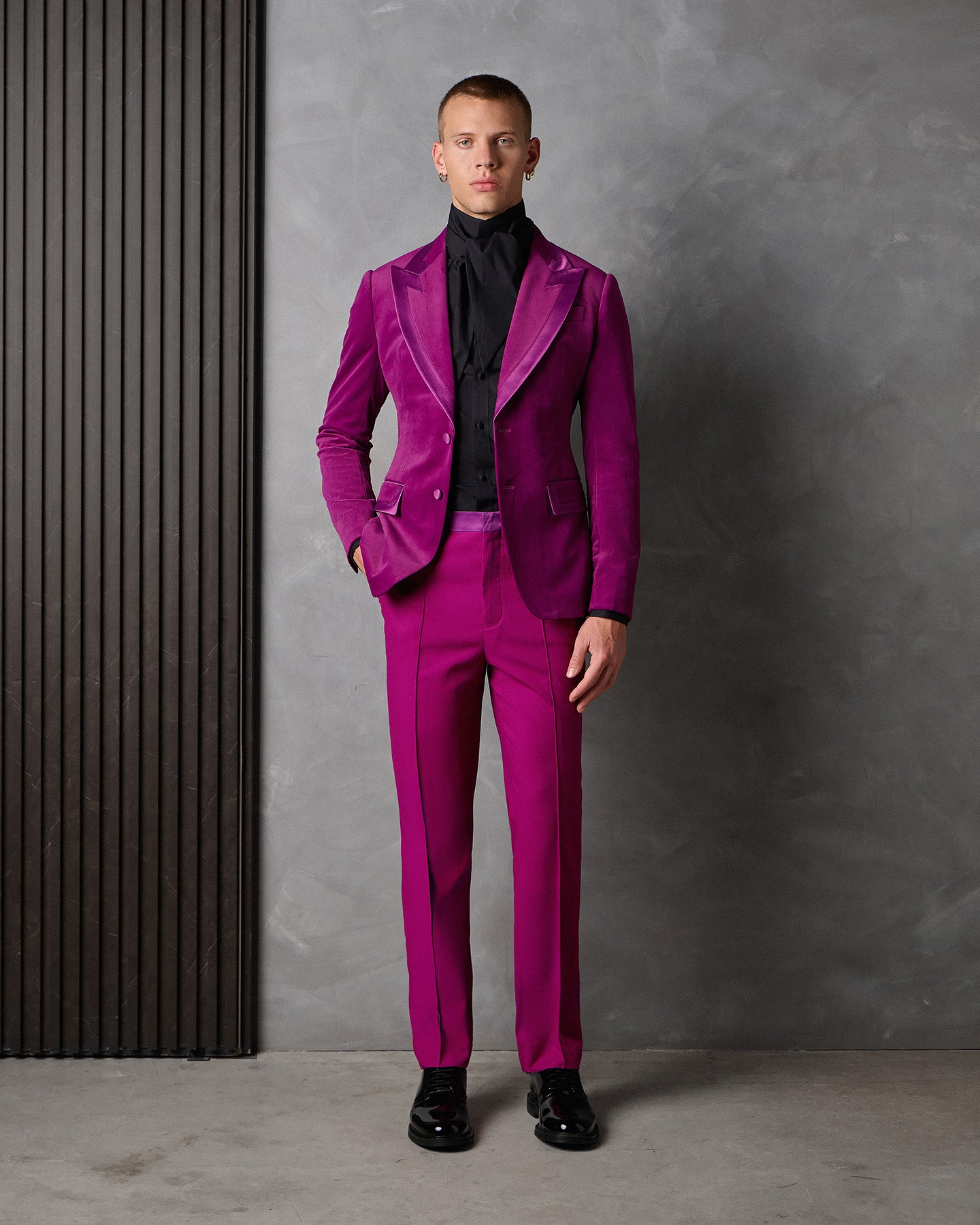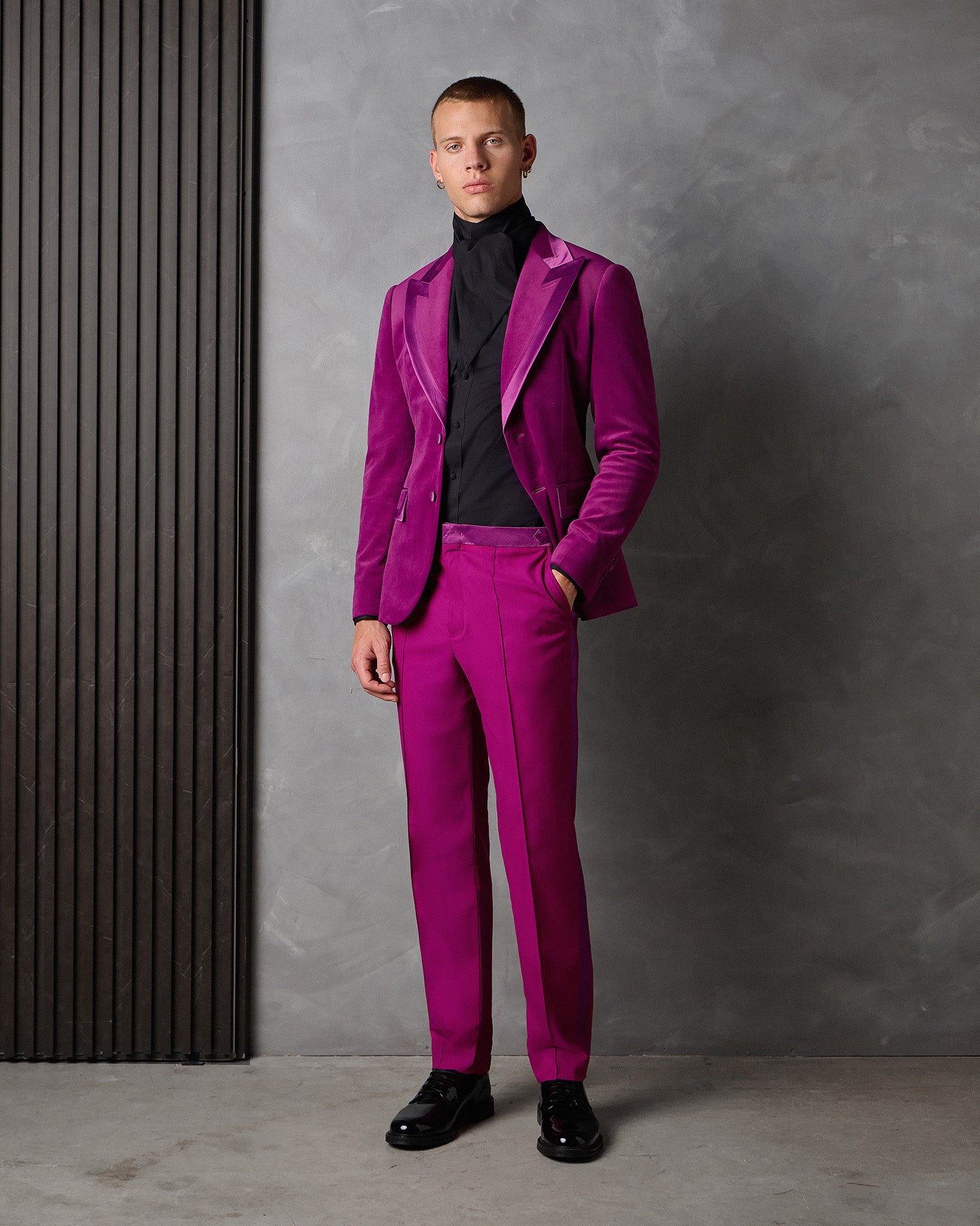 Tailored in a magenta velvet from Italy. Trimmed in silk mikado.