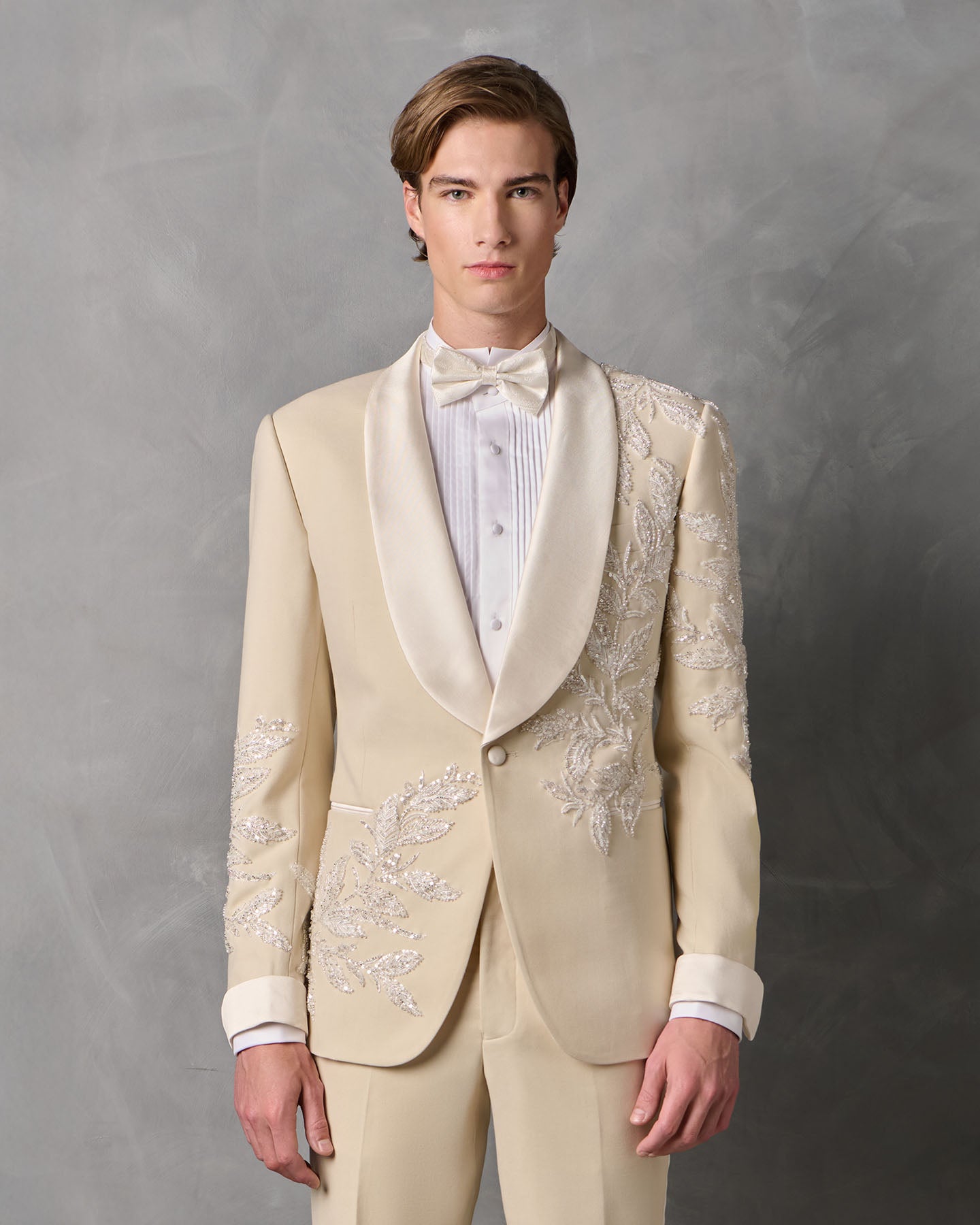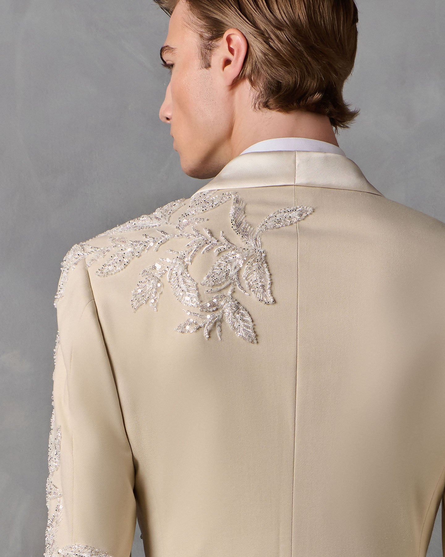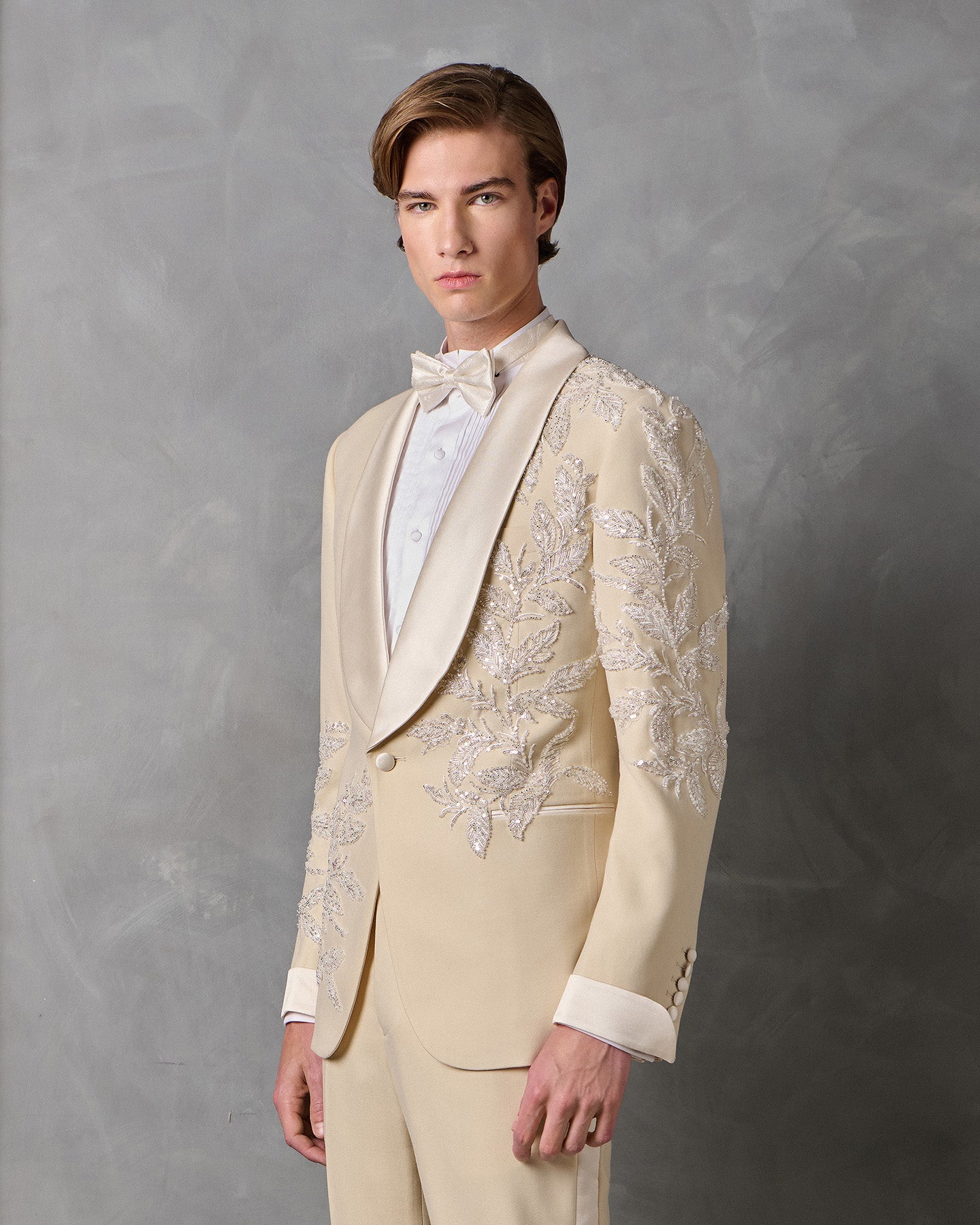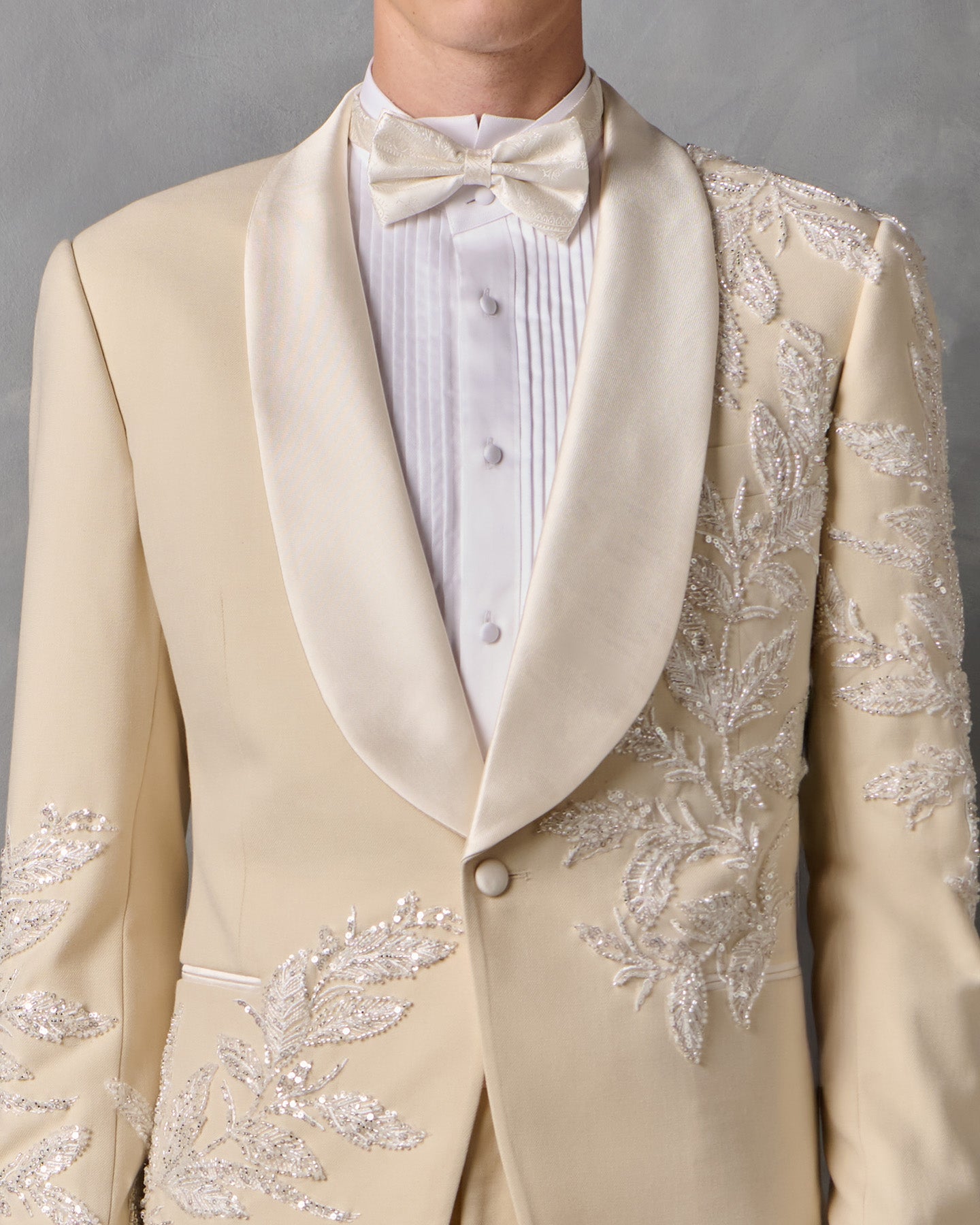 Tailored in a ivory super 120's wool from Italy. Trimmed in silk mikado and embellished with crystal beaded lace.