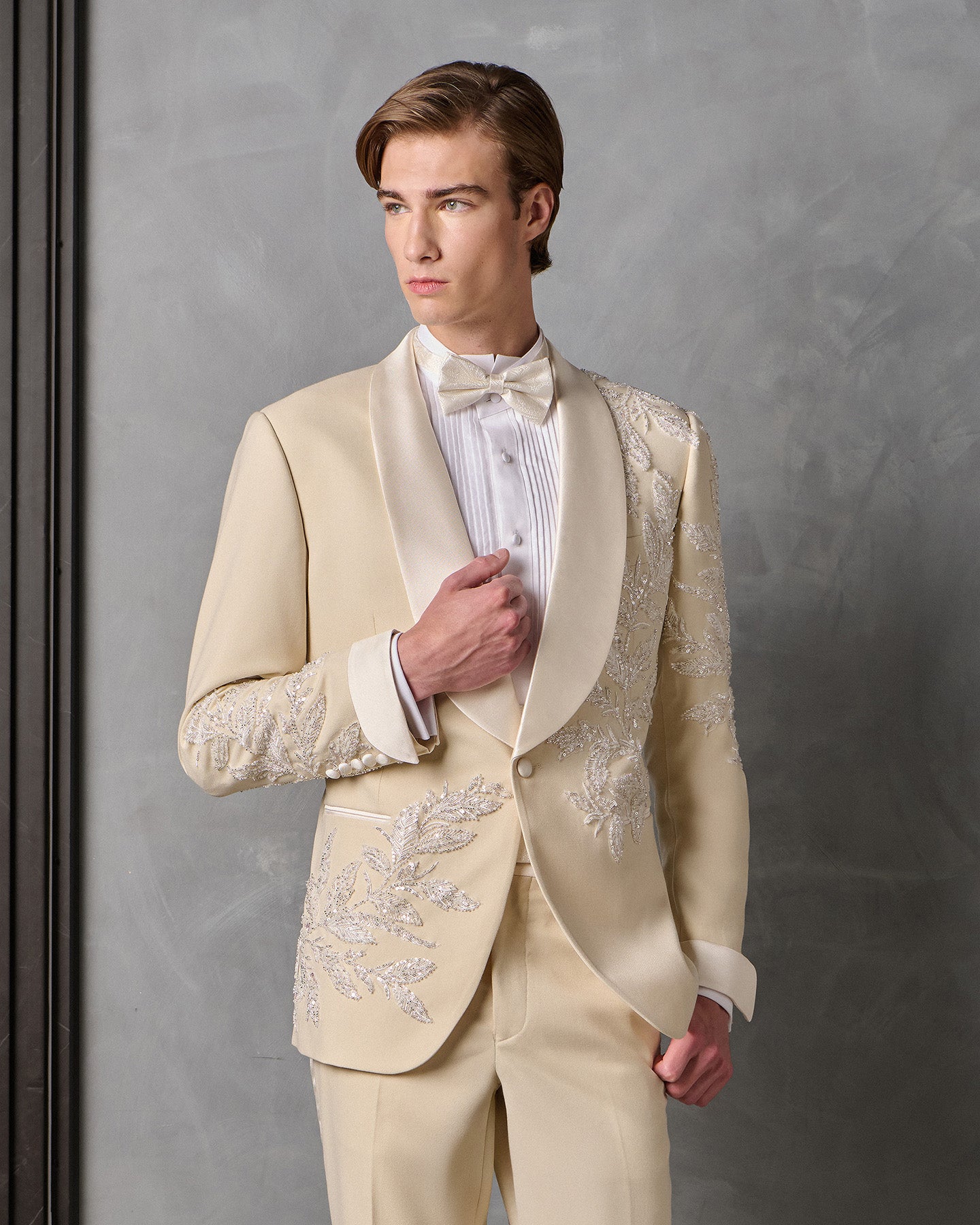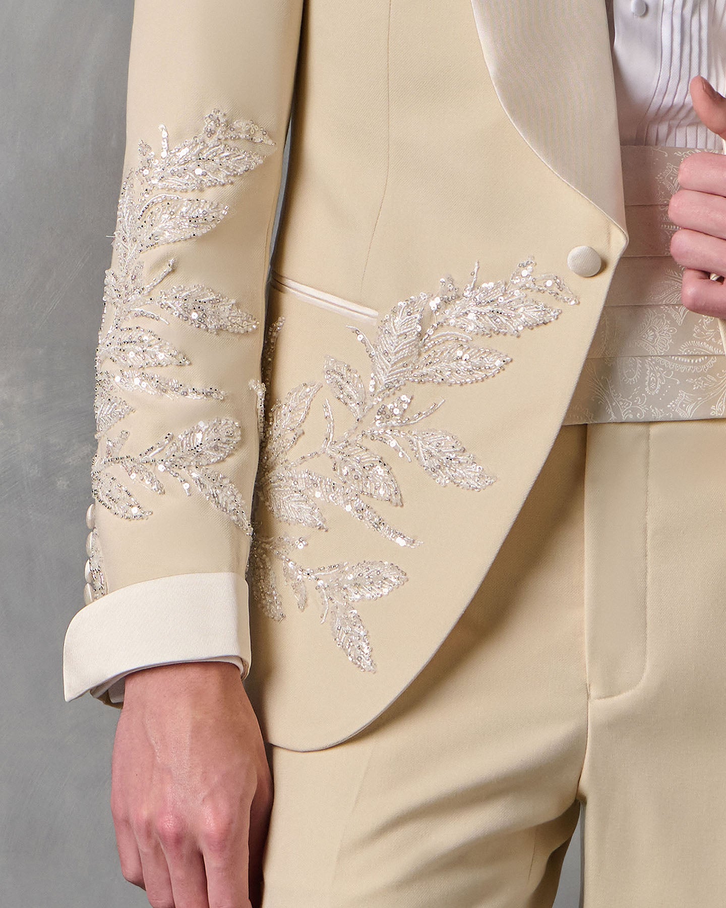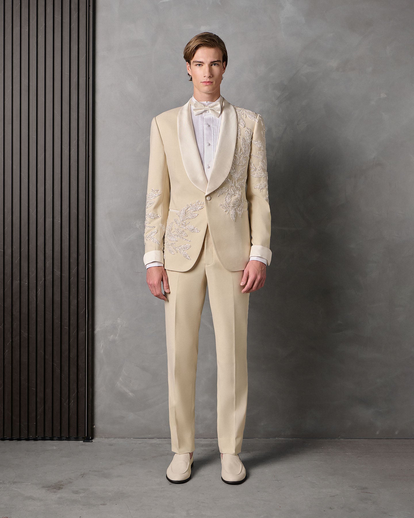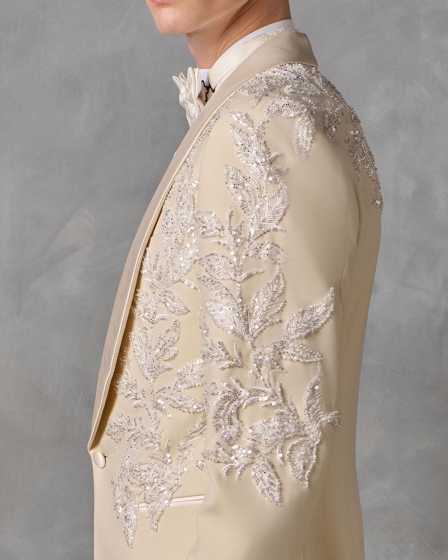 Tailored in a ivory super 120's wool from Italy. Trimmed in silk mikado and embellished with crystal beaded lace.