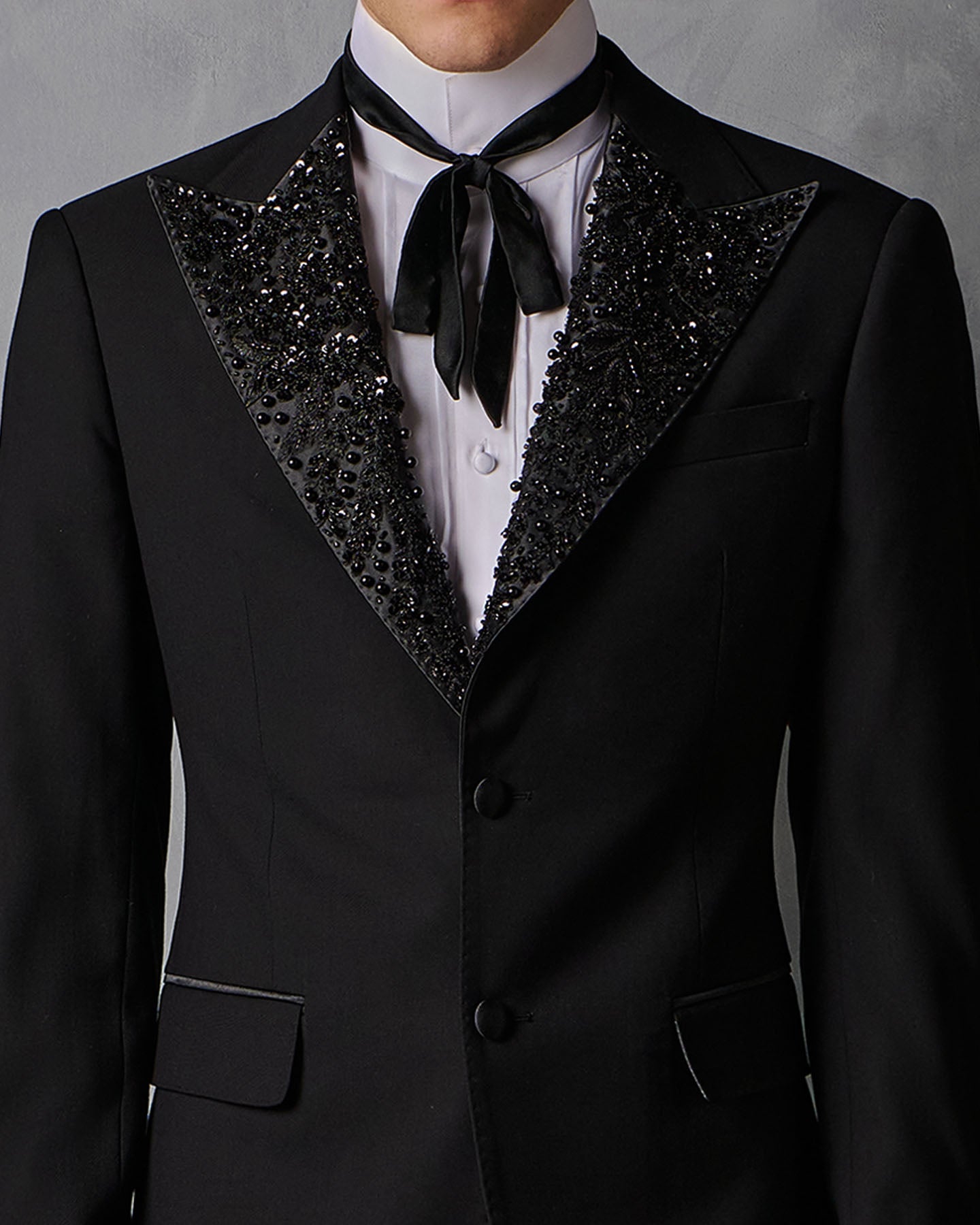 A single breasted 2 button jacket features a beaded peak lapel collar, 2 button closure and front flap pockets with hand-stitched edges. Constructed with covered buttons and a vent at the back this jacket features a sleek waist defining shape. The interior is fully finished in silver paisley print satin lining and features interior pockets.