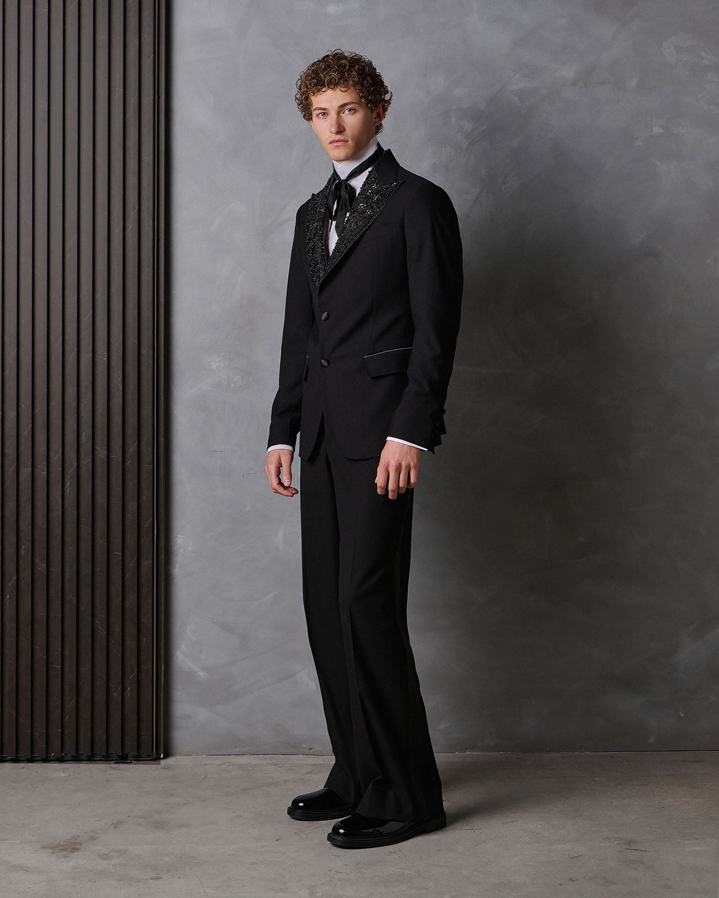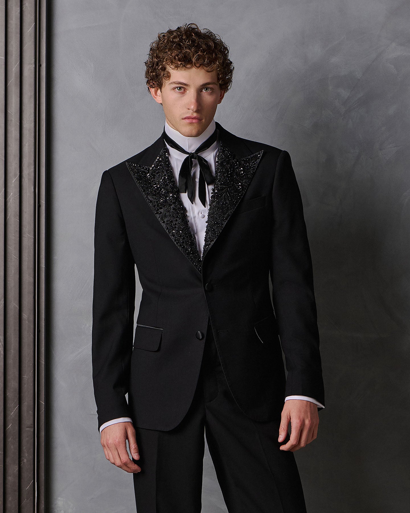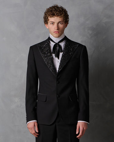 Tailored in black super 120's wool from Italy. Trimmed in silk mikado and embellished with hand-sewn jet black crystals.