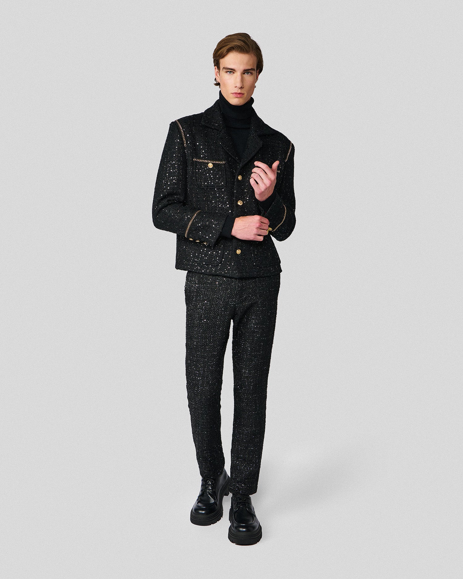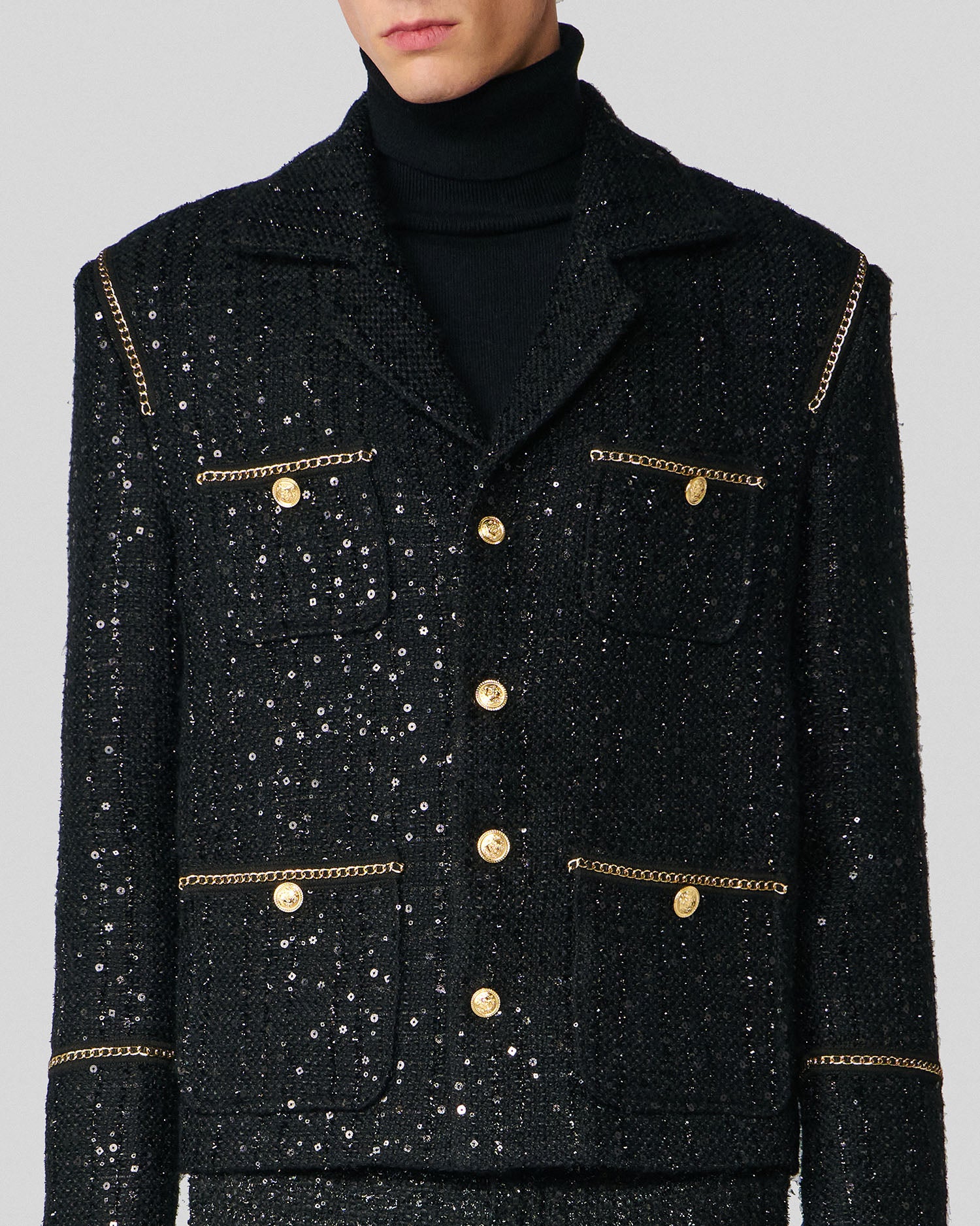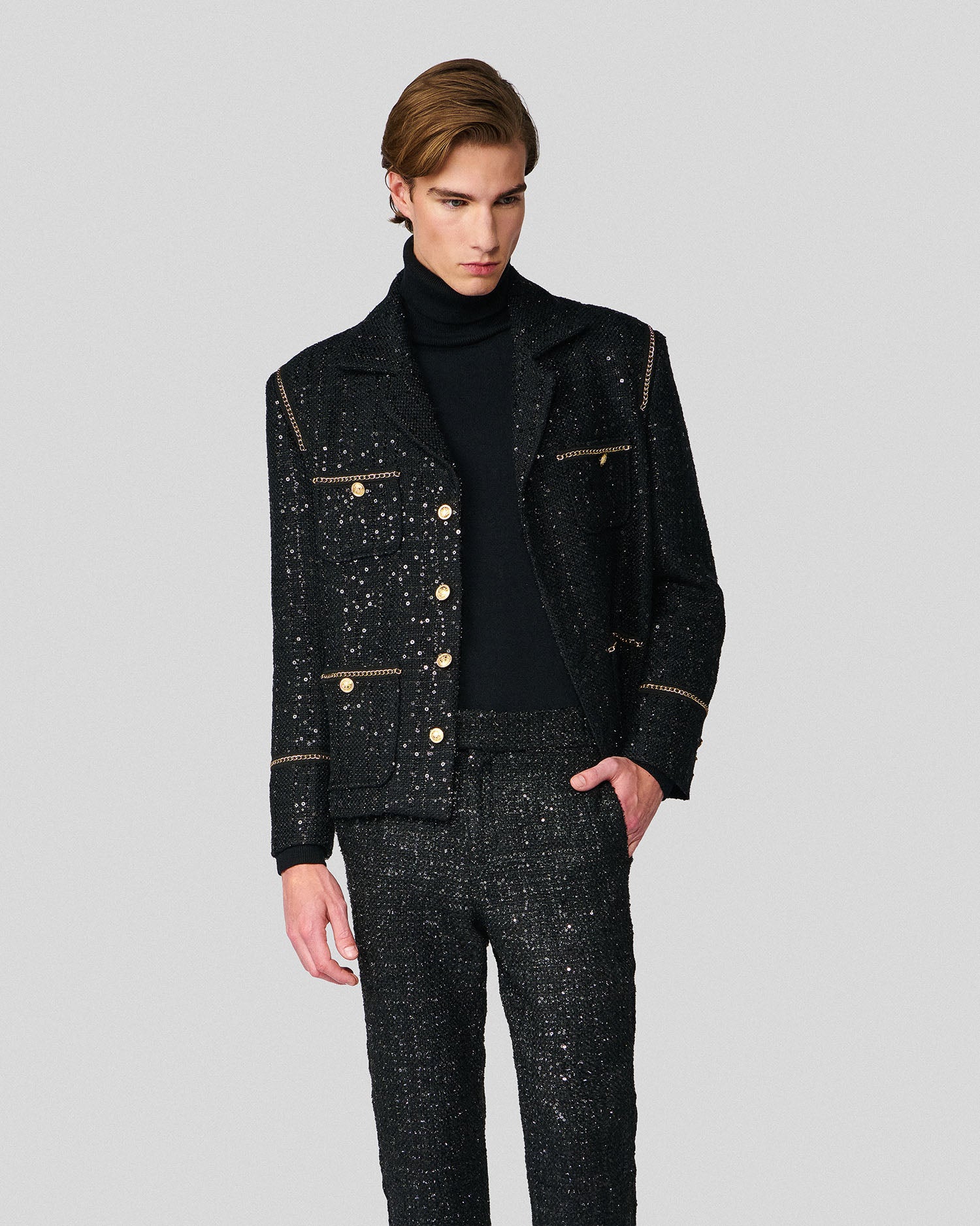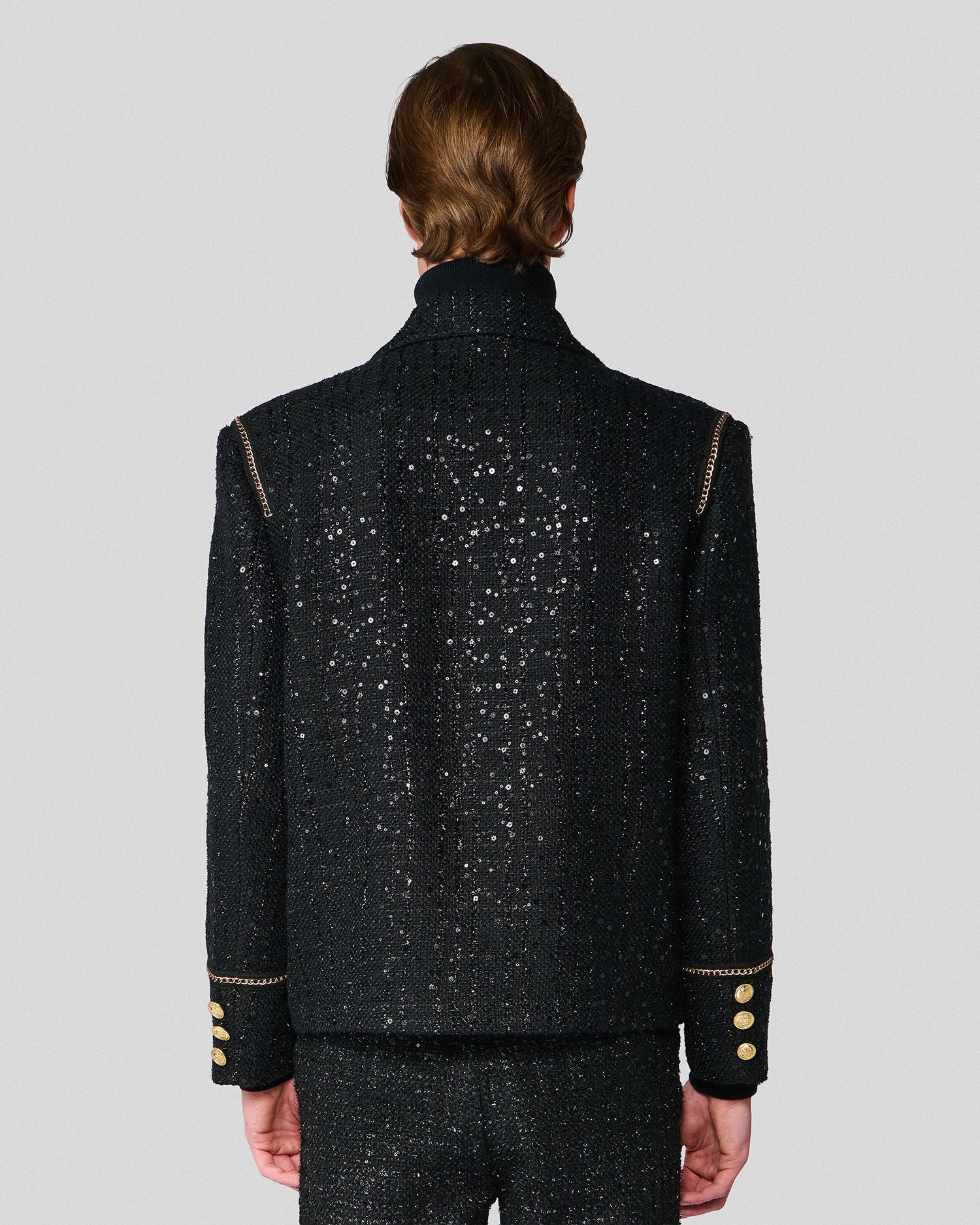 The Atticus Jacket is a Chanel inspired cardigan jacket that features chain trim details and a luxe tweed fabric dusted with tiny black sequins.