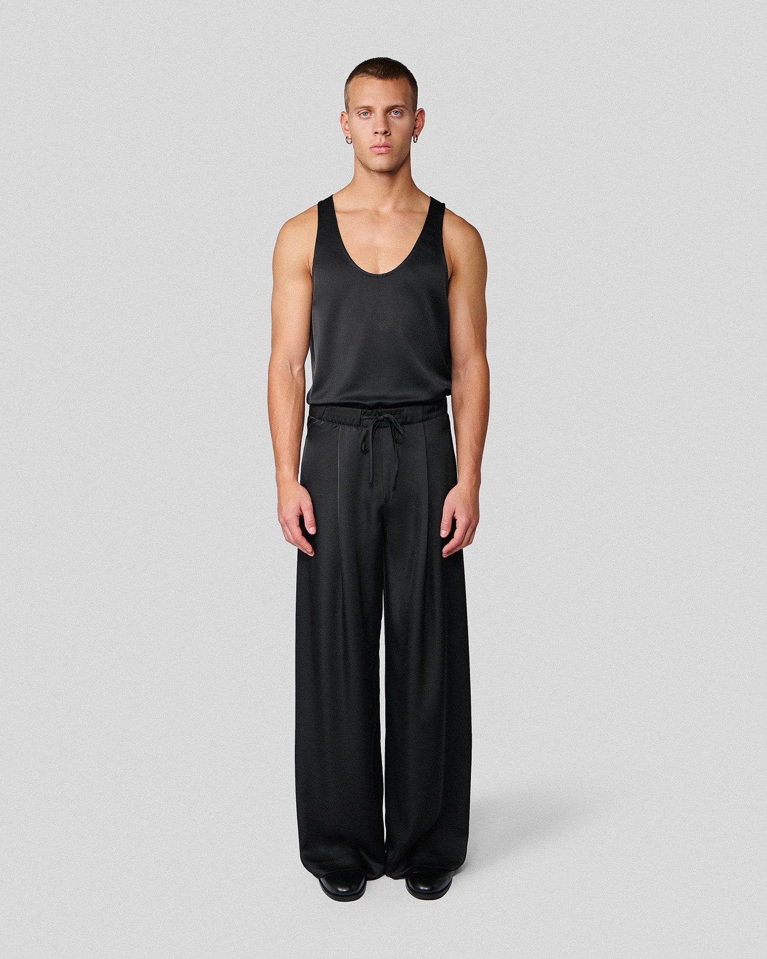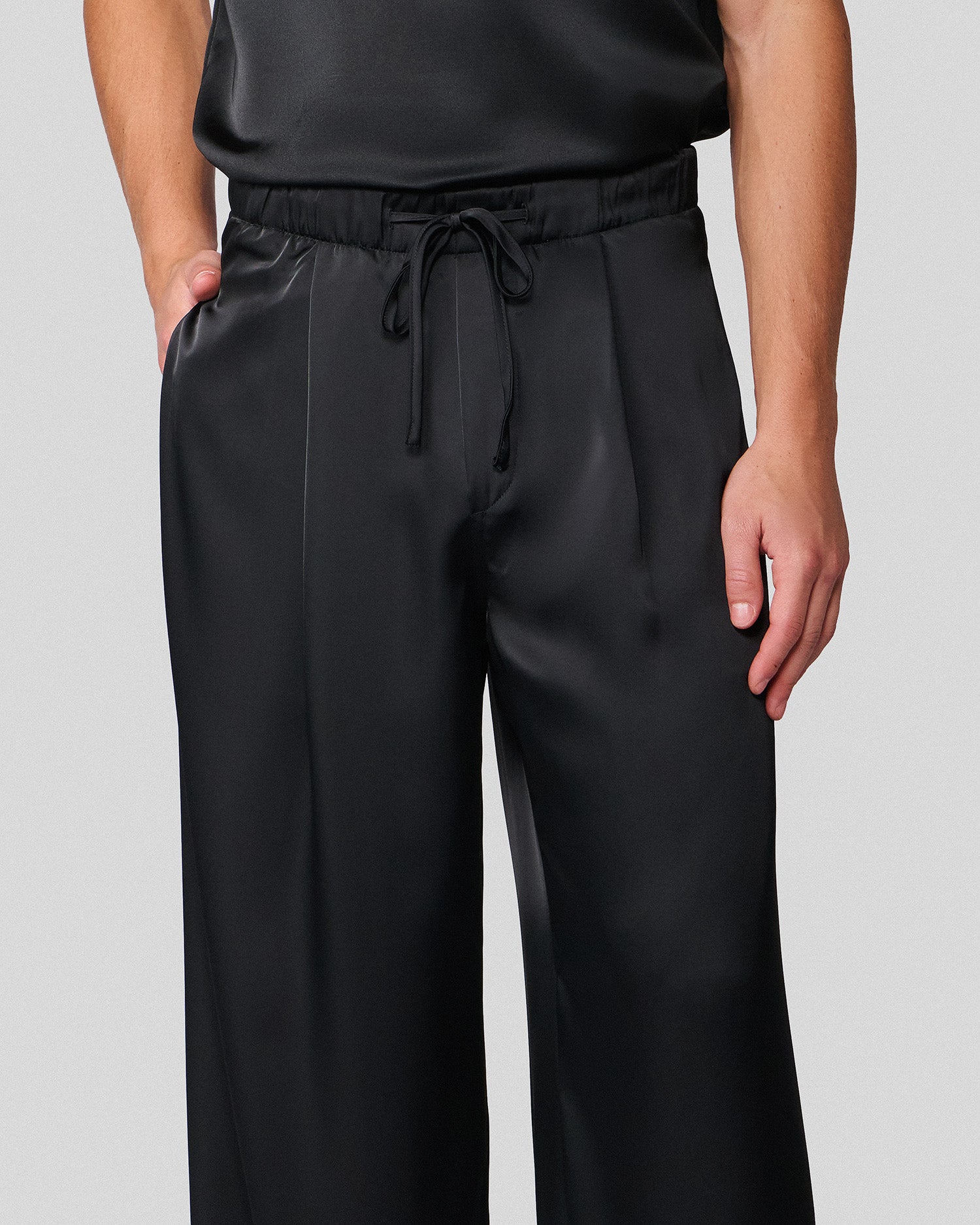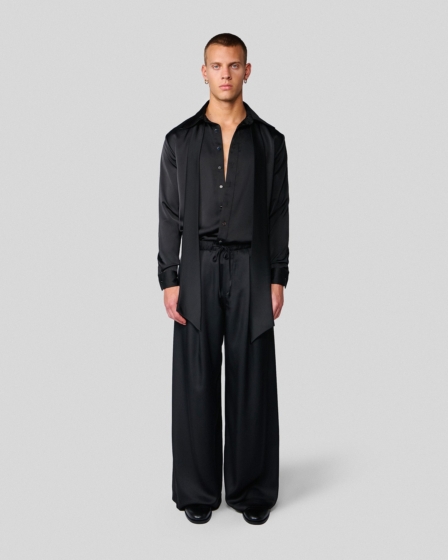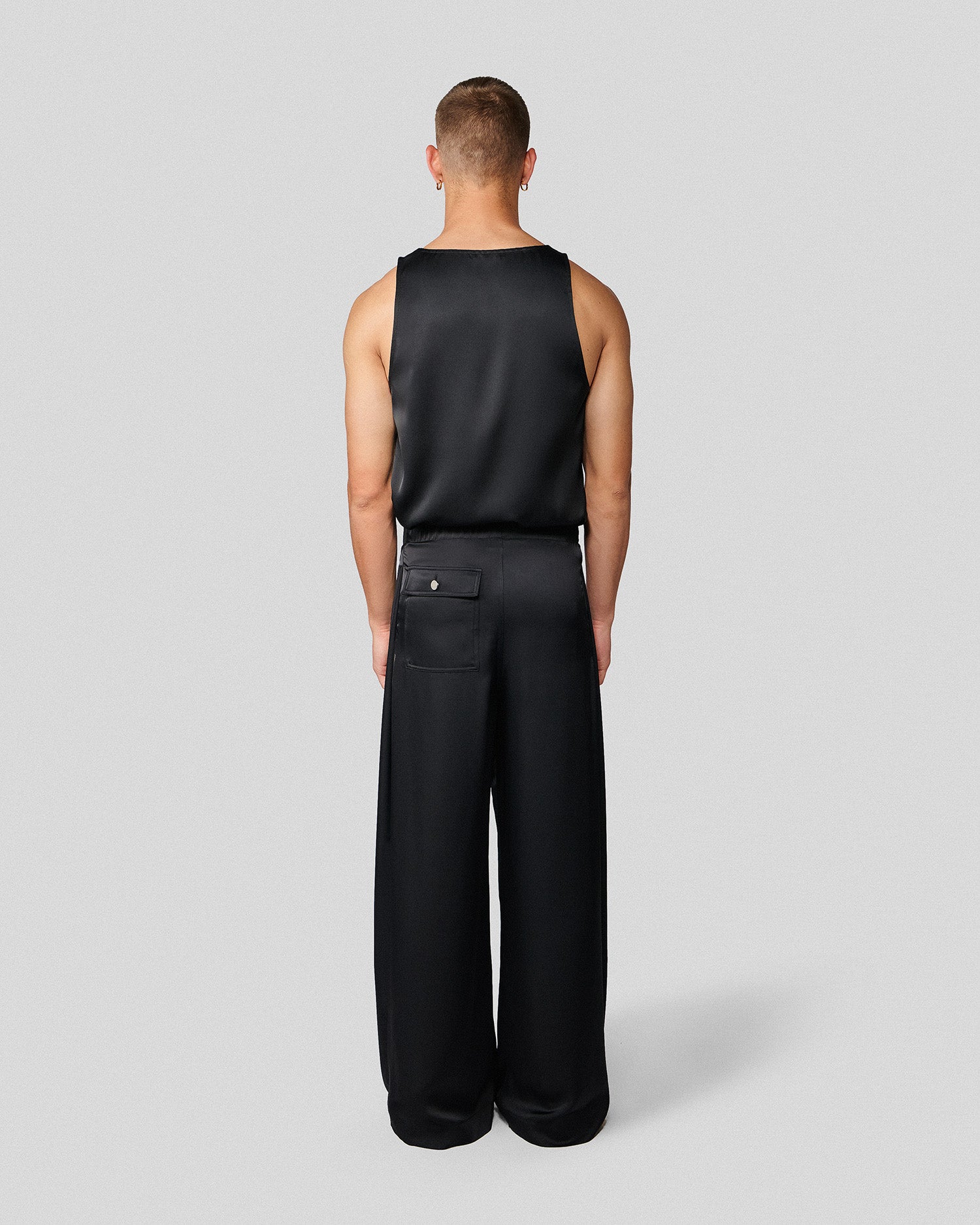 The Egon Wide Leg Pant is made from sleek black satin and cut with an extra wide leg for fluid movement and drape.
