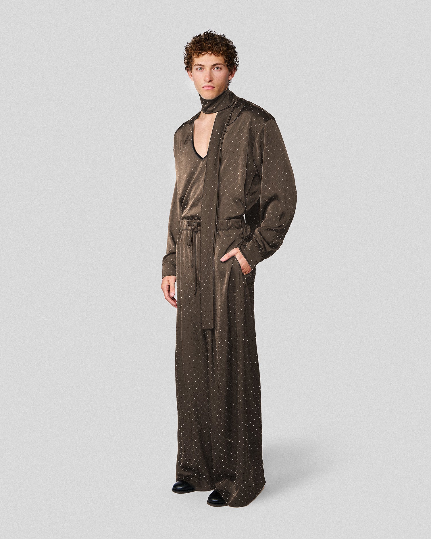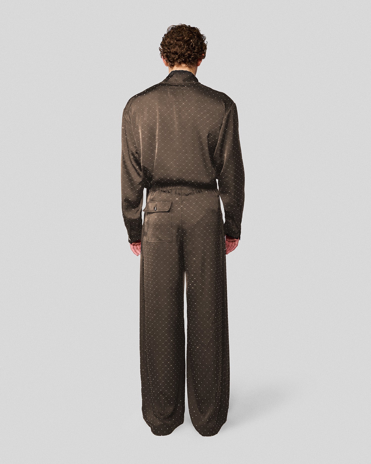 The Egon Wide Leg Pant is made from sleek rich satin covered in silver crystals and cut with an extra wide leg for fluid movement and drape.