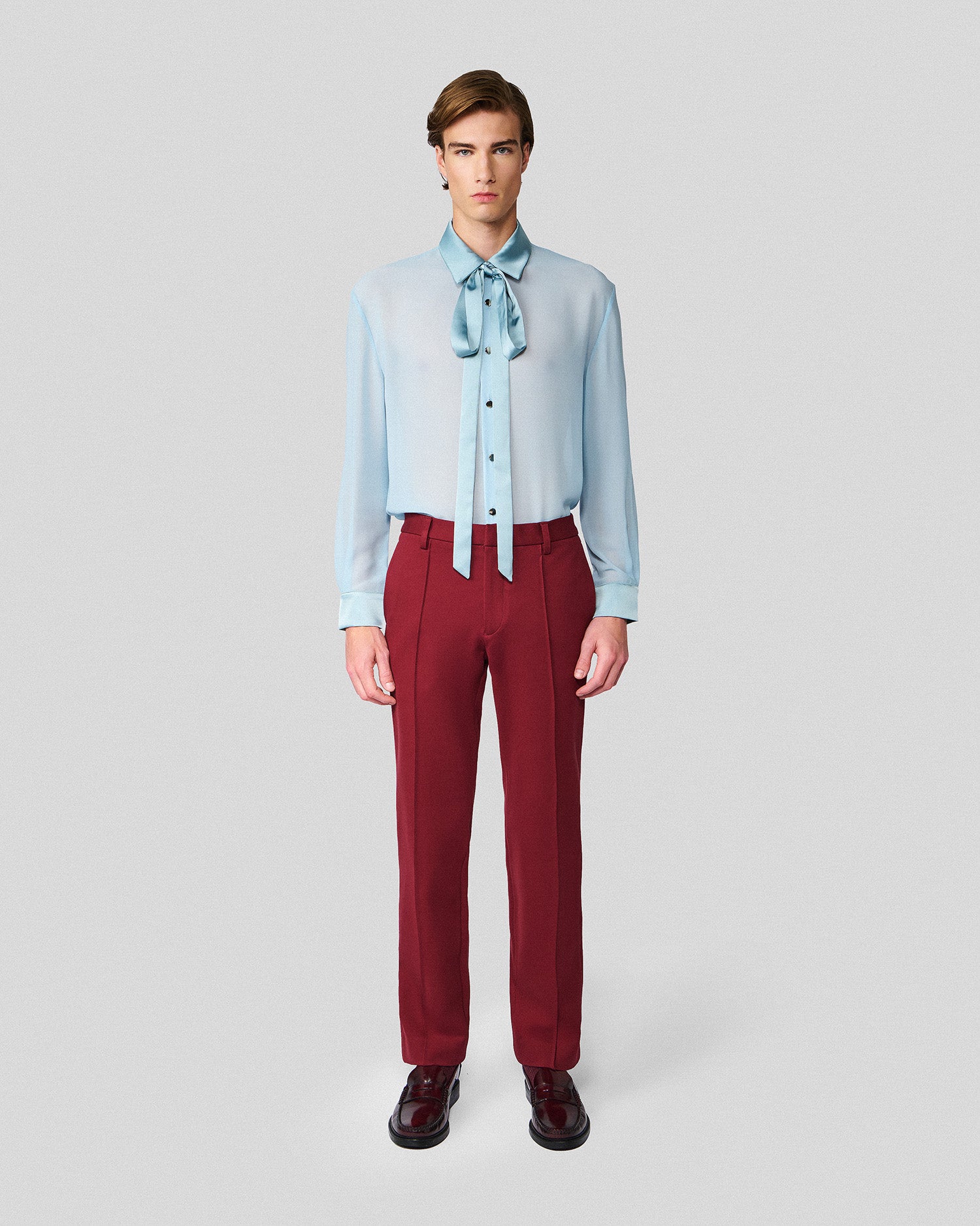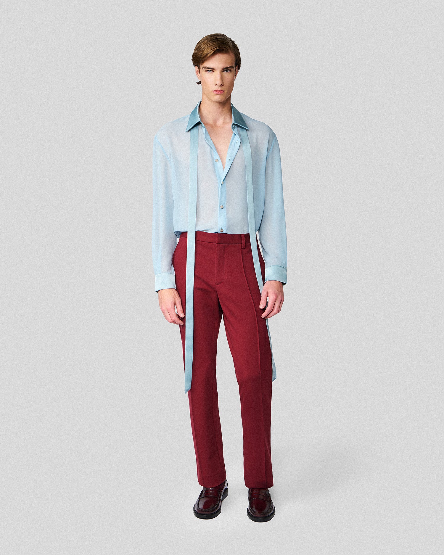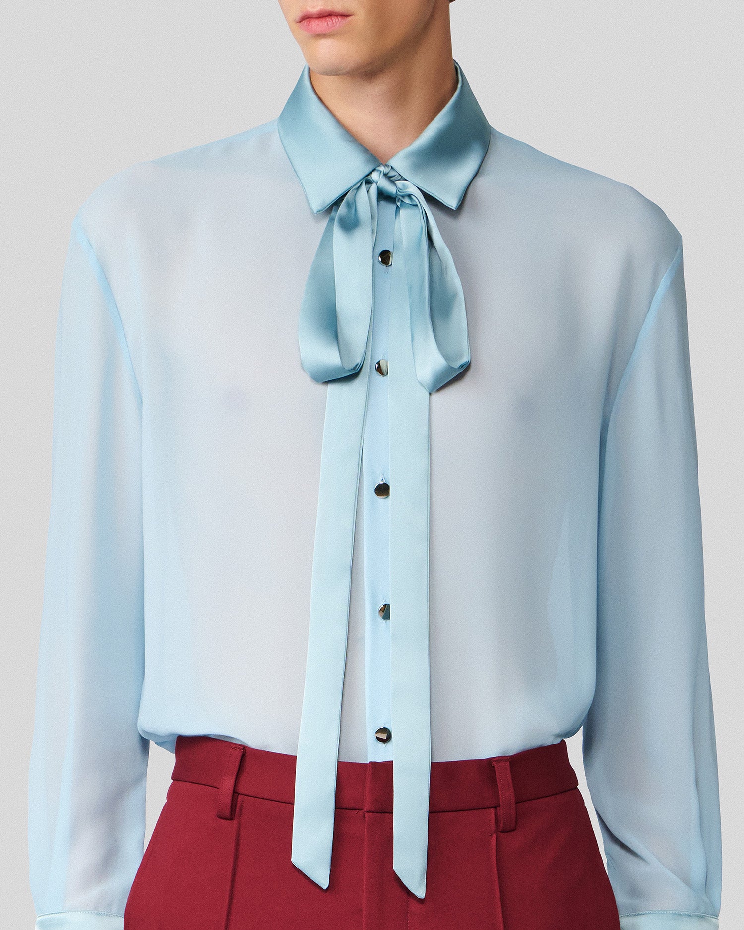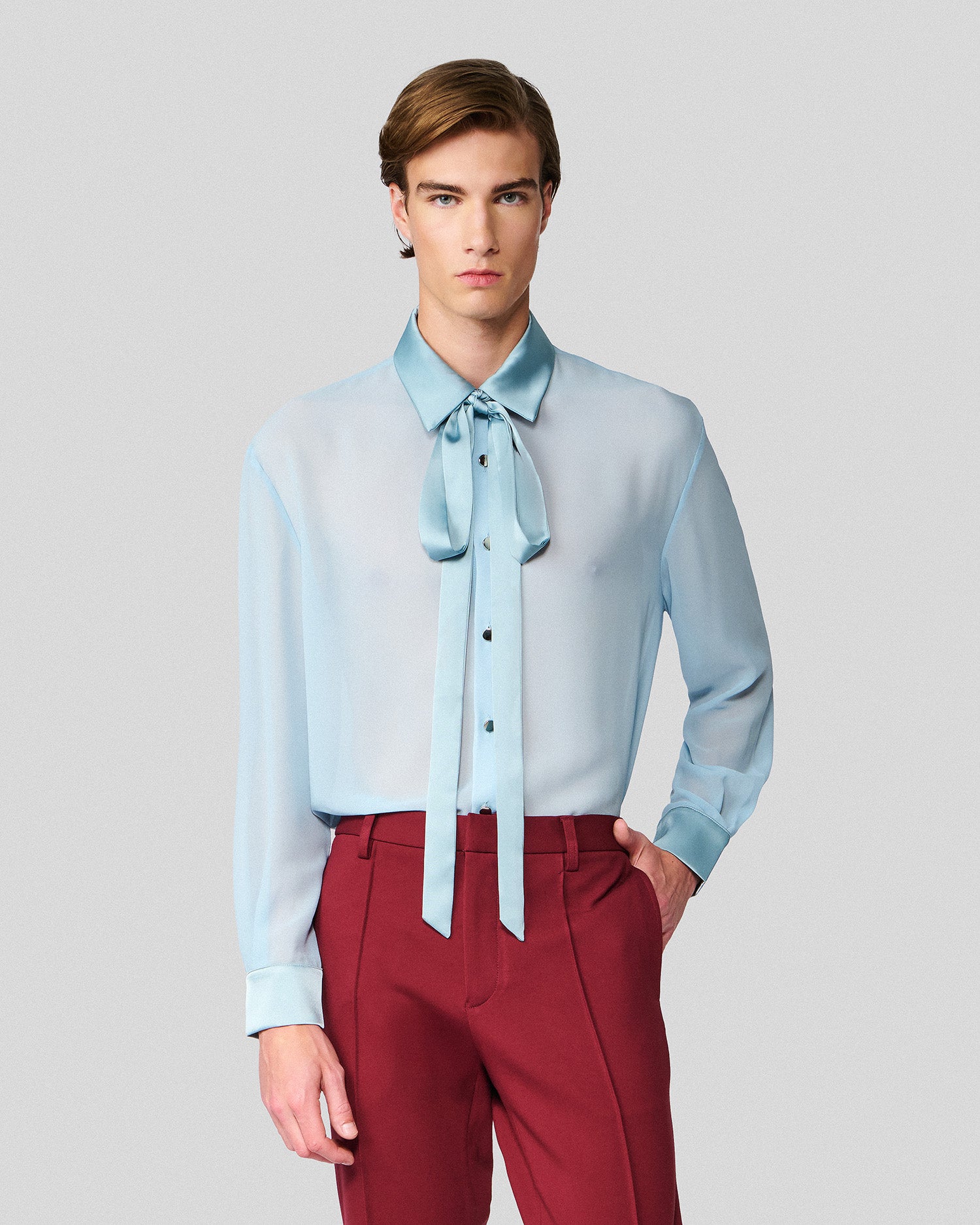 The Ignacio Shirt is crafted from super-fine crepe chiffon trimmed in satin. A separate necktie can be worn loose, looped of tied in a bow at the neck.