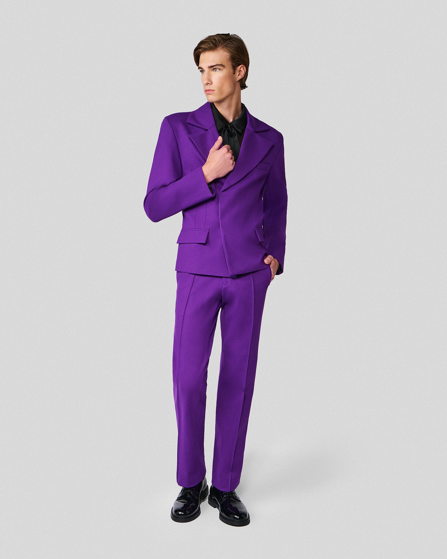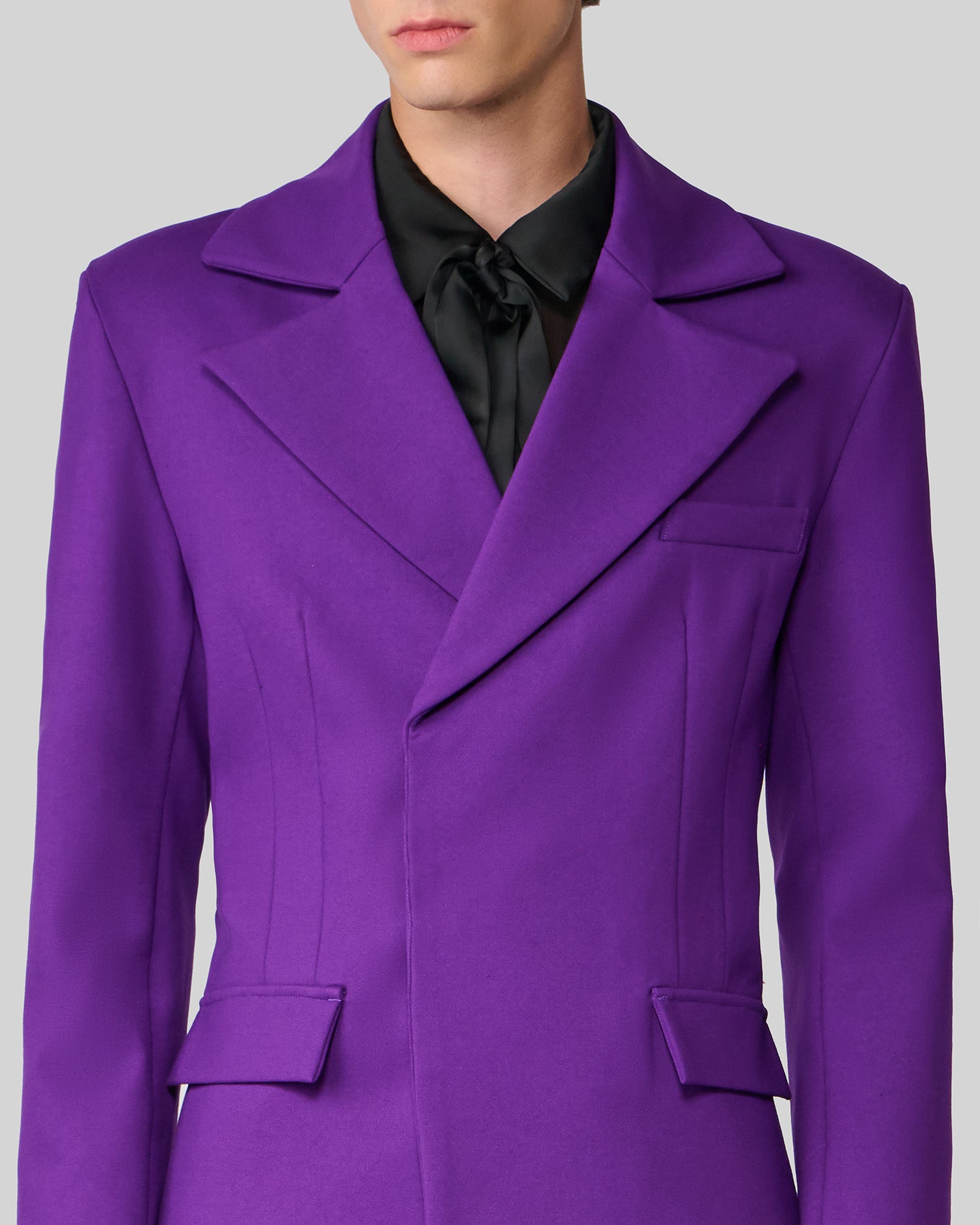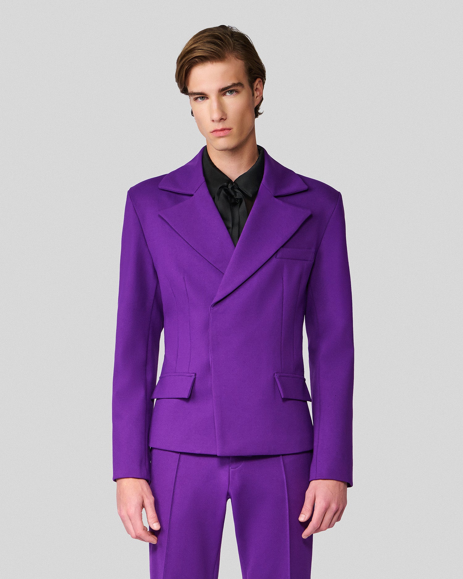 The Lorenzo Jacket is a tailored masterpiece that blends a sleek structured silhouette with a bold shade of royal purple. A strong shoulder, wrap front closure and fitted waist define this style in a thick premium stretch fabric.