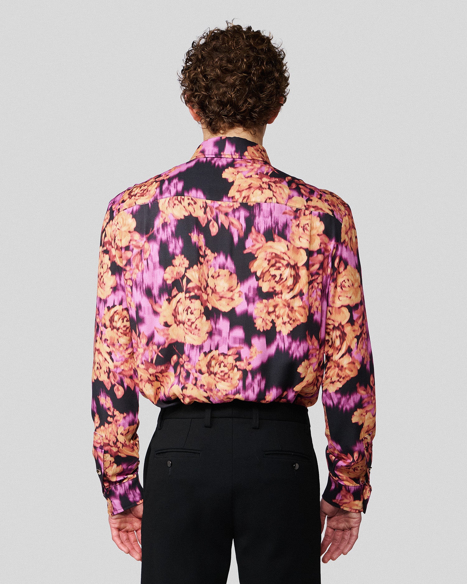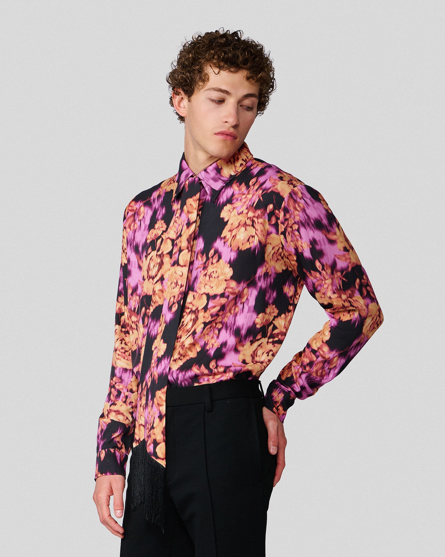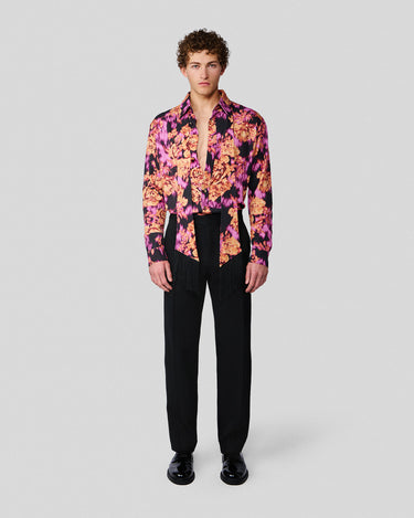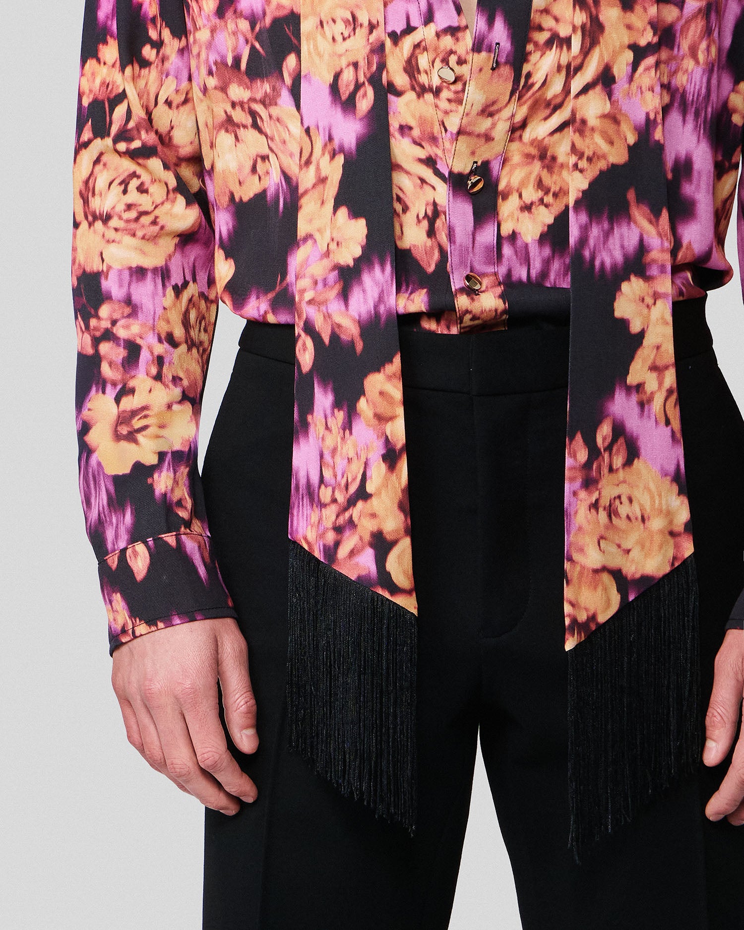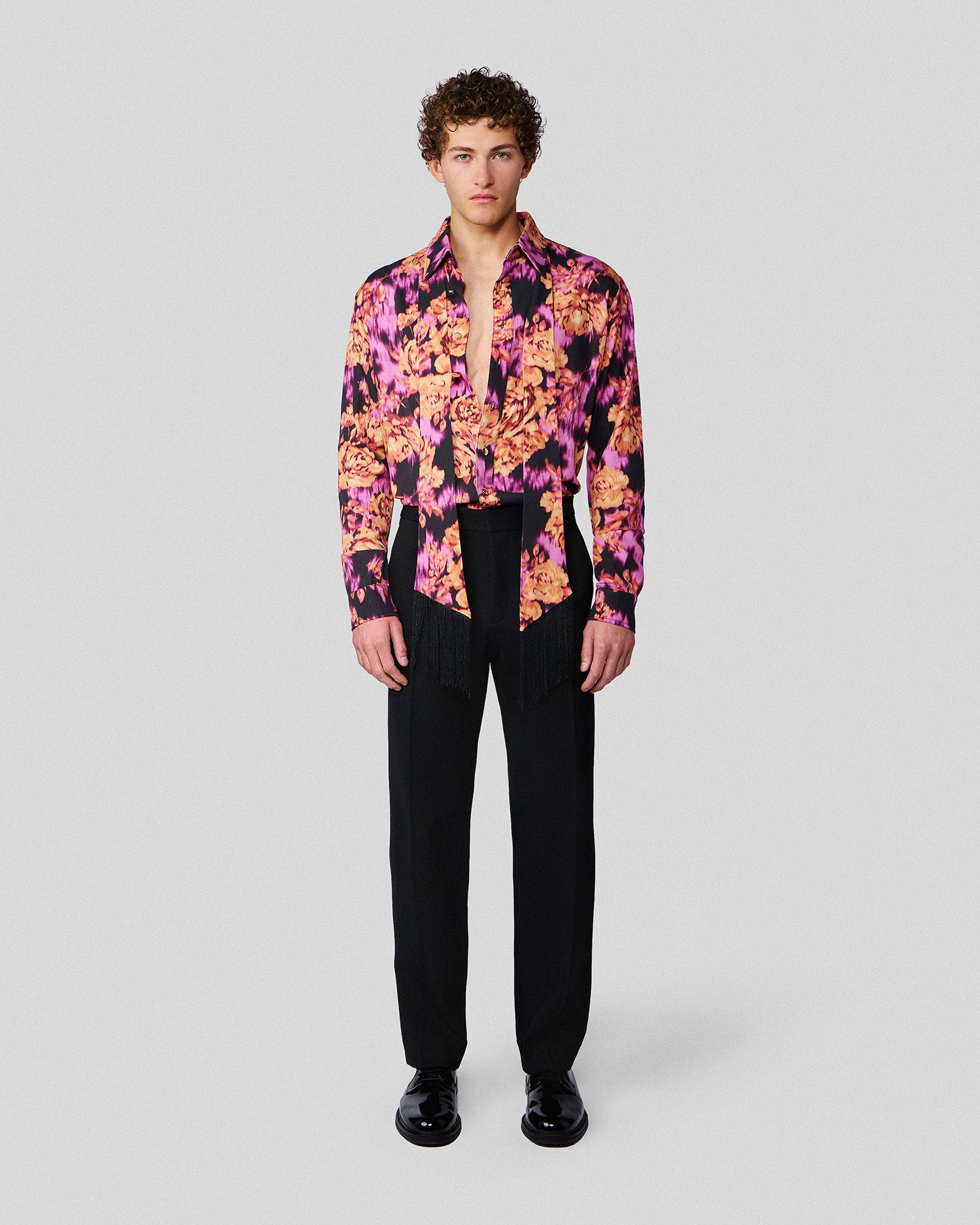 The Ricardo Shirt is a modern take on a classic featuring an abstract floral print and fringed scarf that can be worn in a variety of ways.