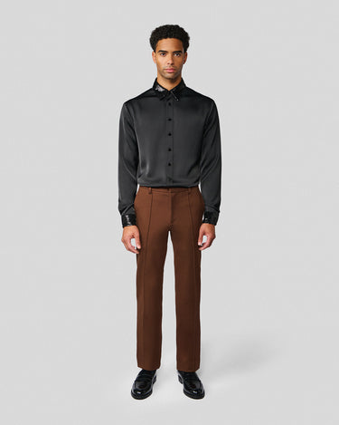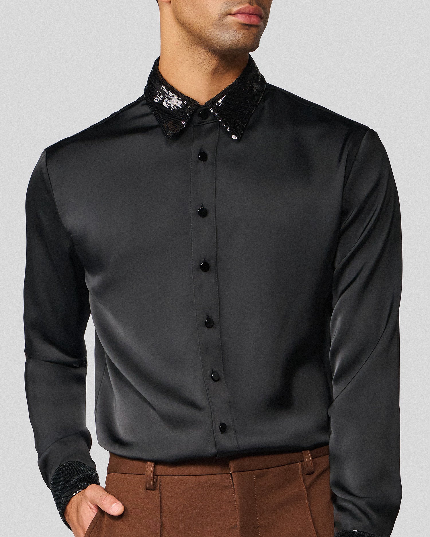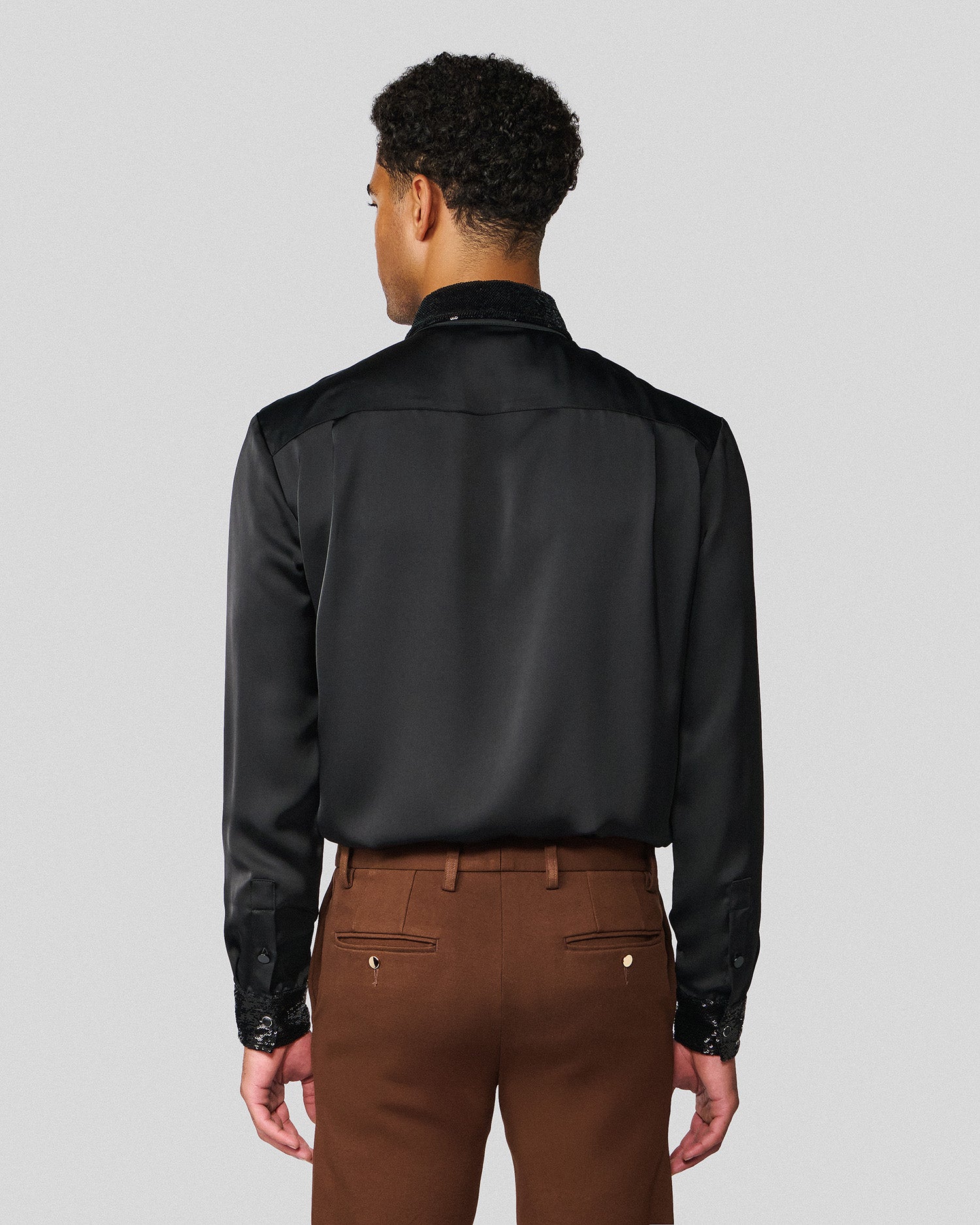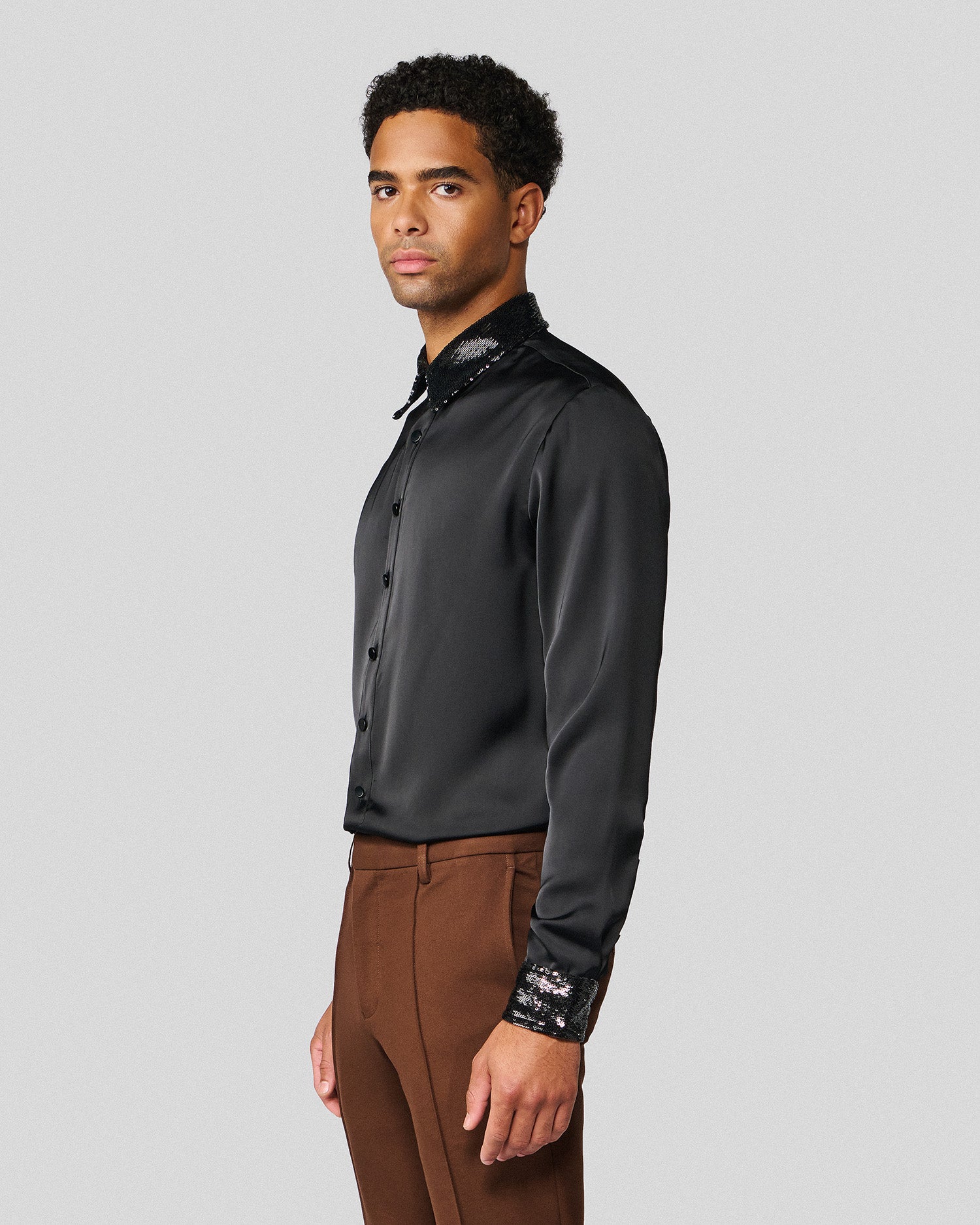 The Ricardo Shirt is a made from sumptuous satin and features a sequin collar and cuffs for a touch of bold elegance.