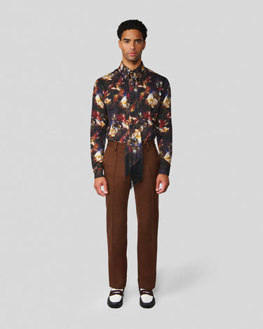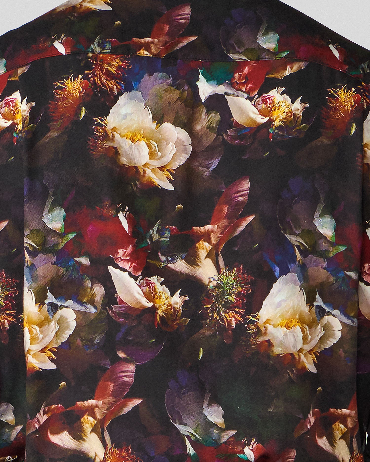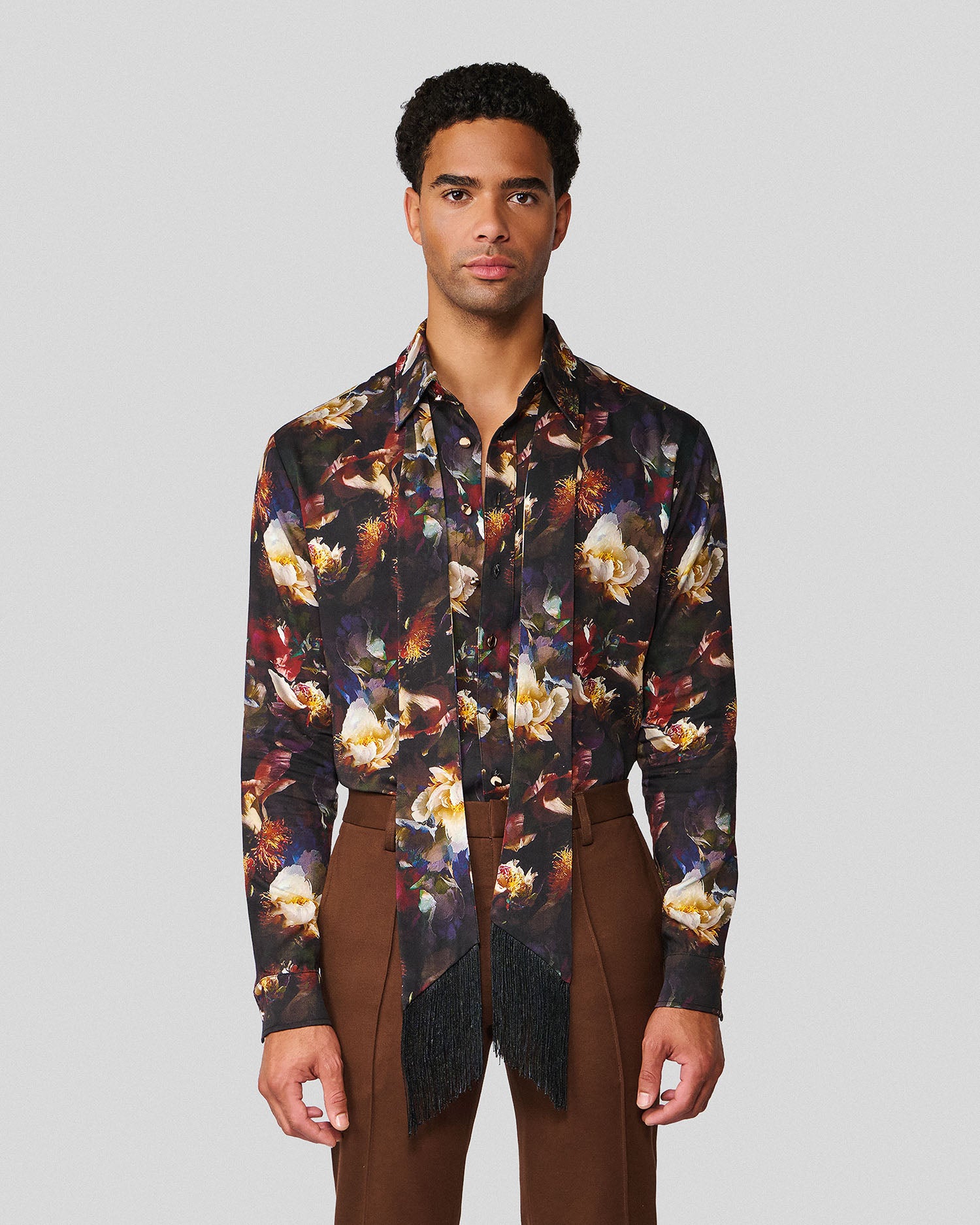 The Ricardo Shirt is a modern take on a classic featuring a photo floral print and fringed scarf that can be worn in a variety of ways.