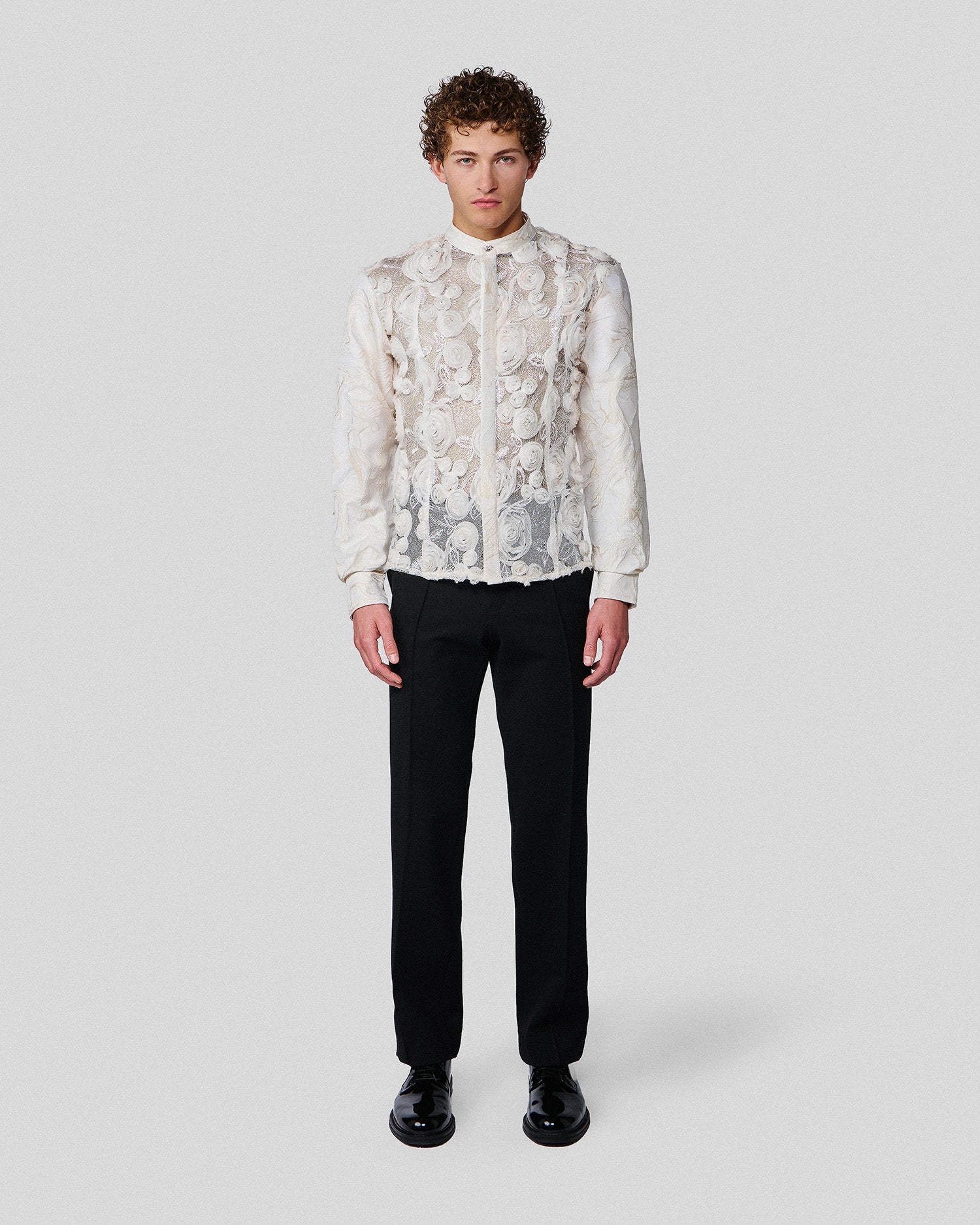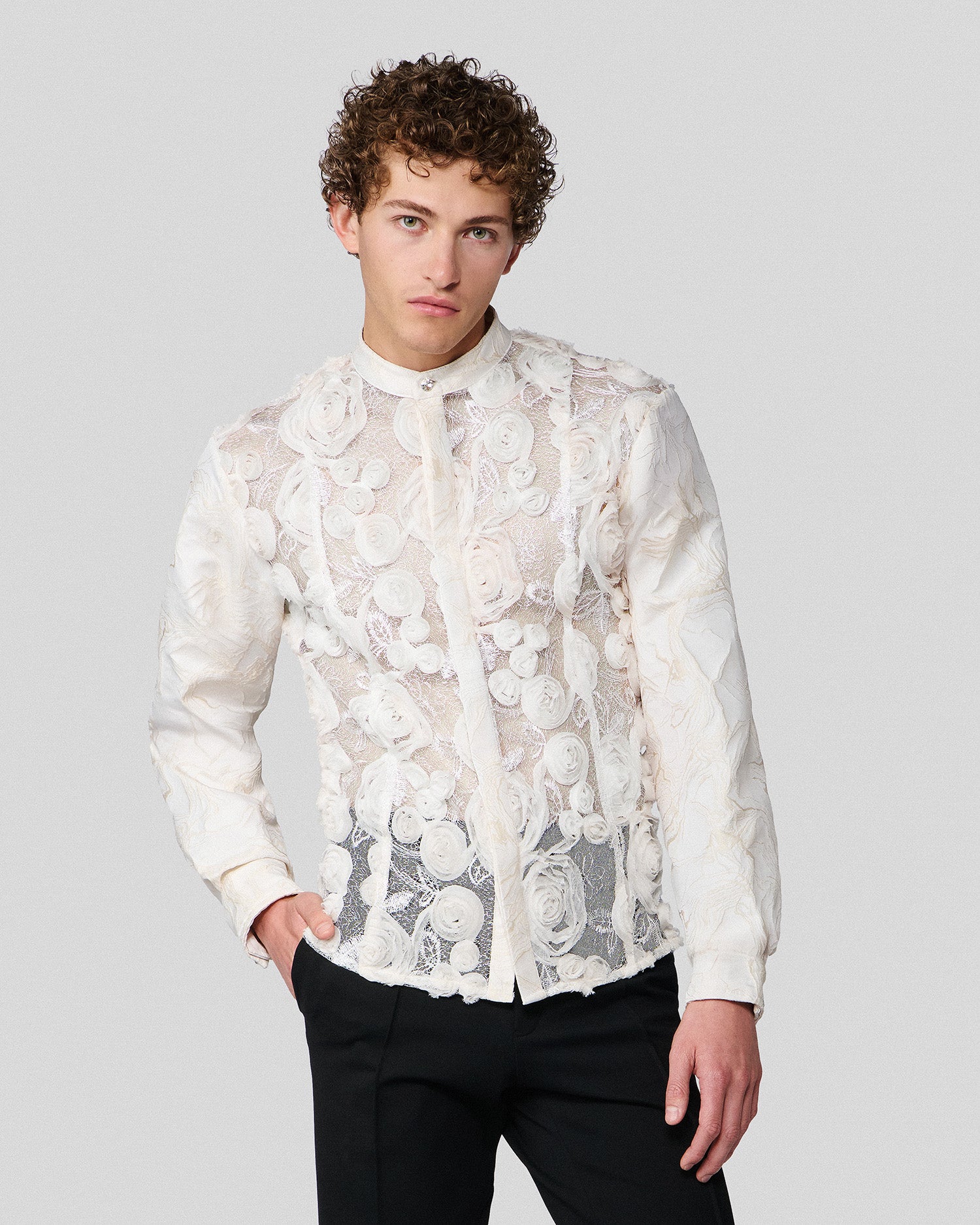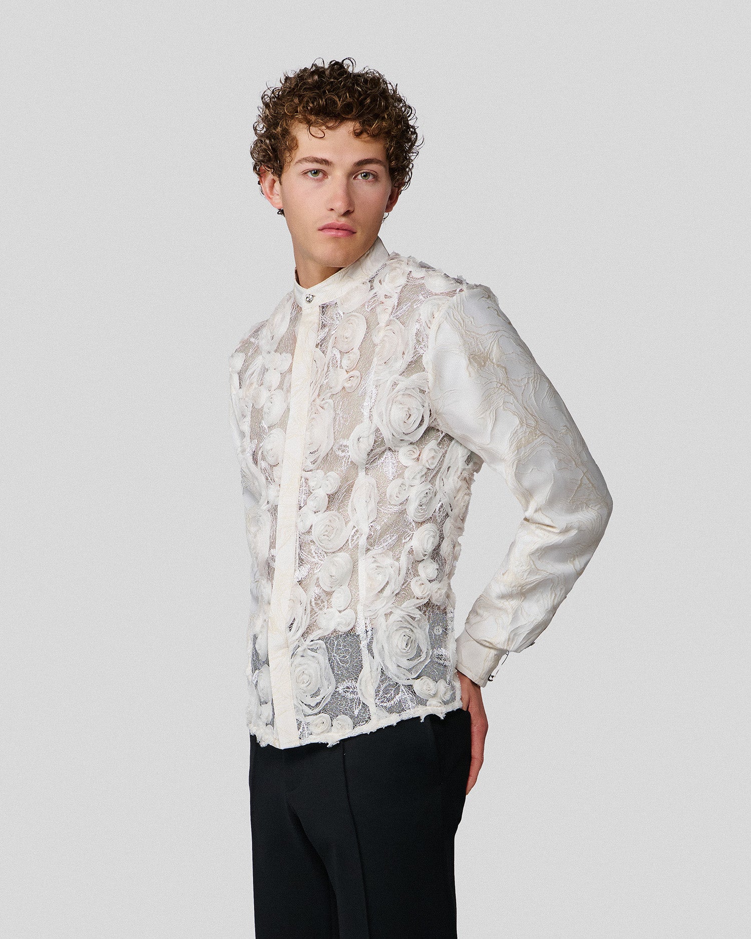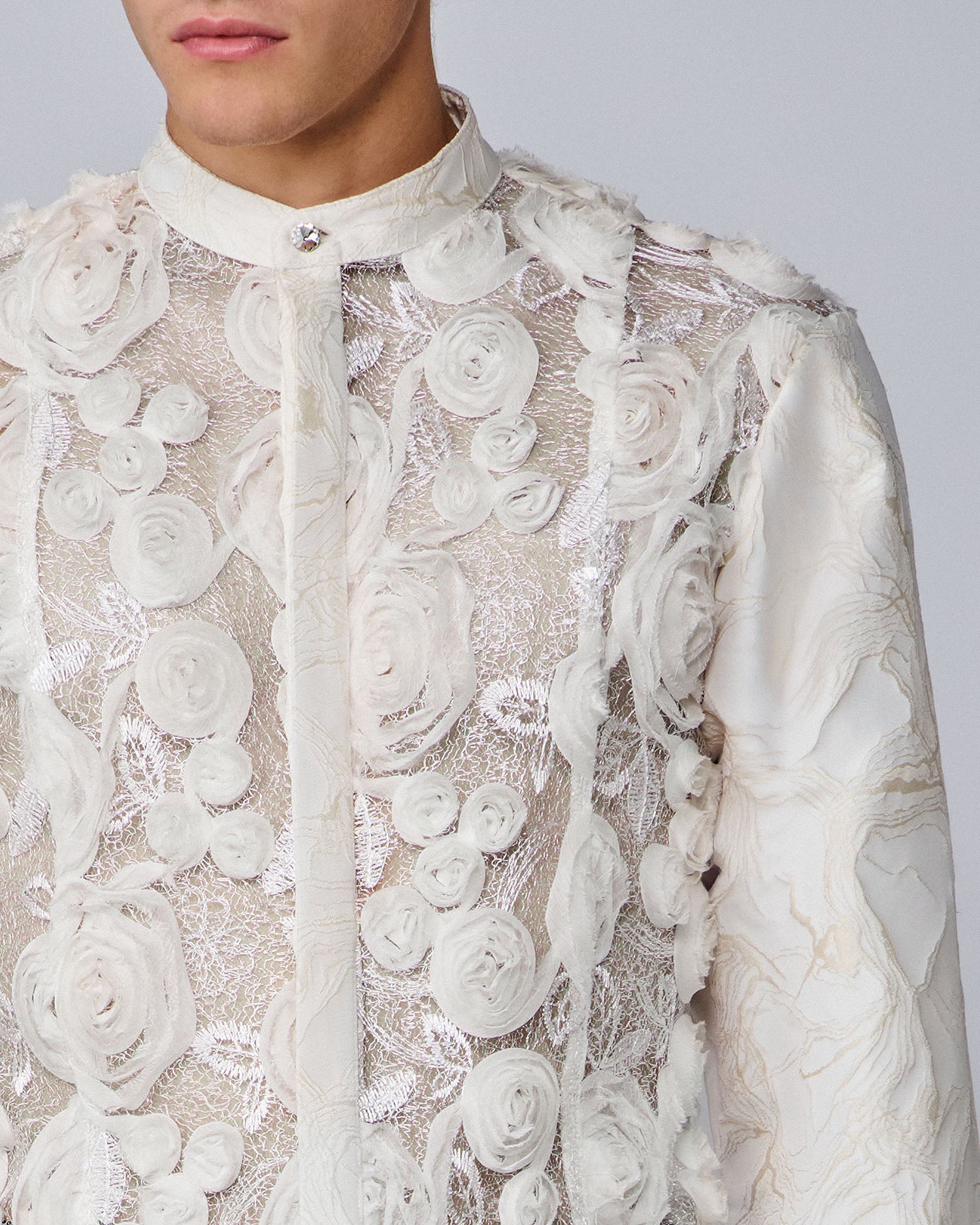 The Solomon Shirt features a 3-D tulle rosette covered body and silk jacquard sleeves. This truly unique piece is a statement all on its own and will garner endless compliments.