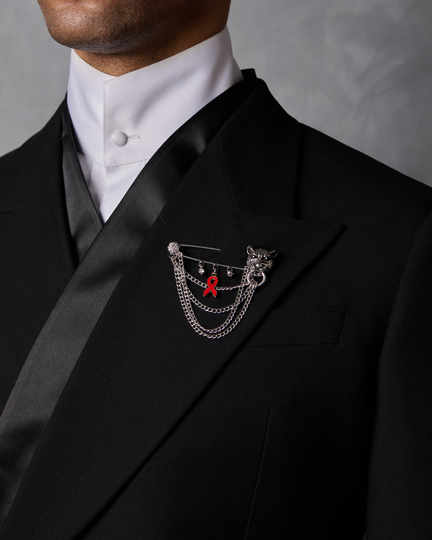 This Red Ribbon Collection pin is crafted in silver metal with stainless steel chain and a red ribbon charm.