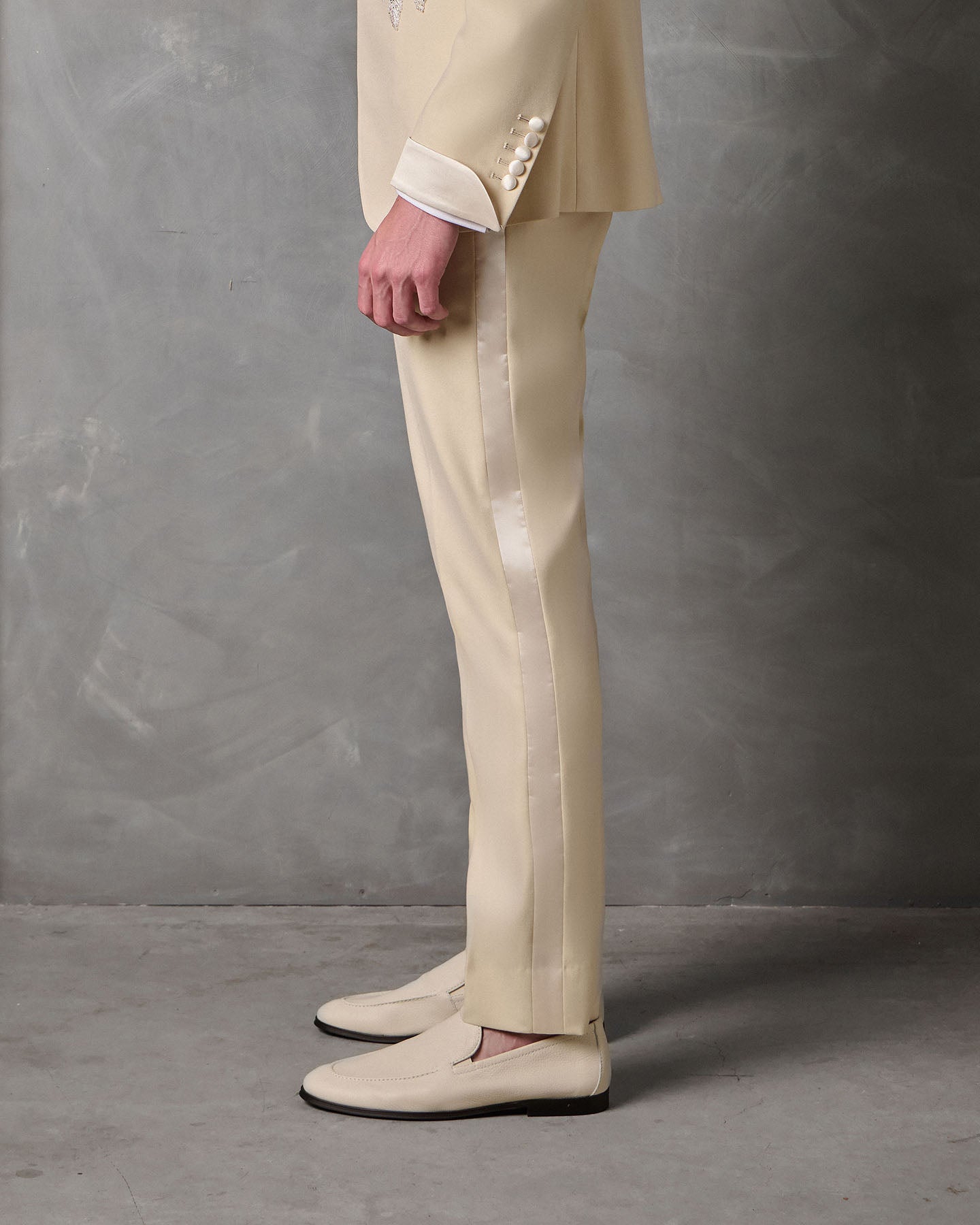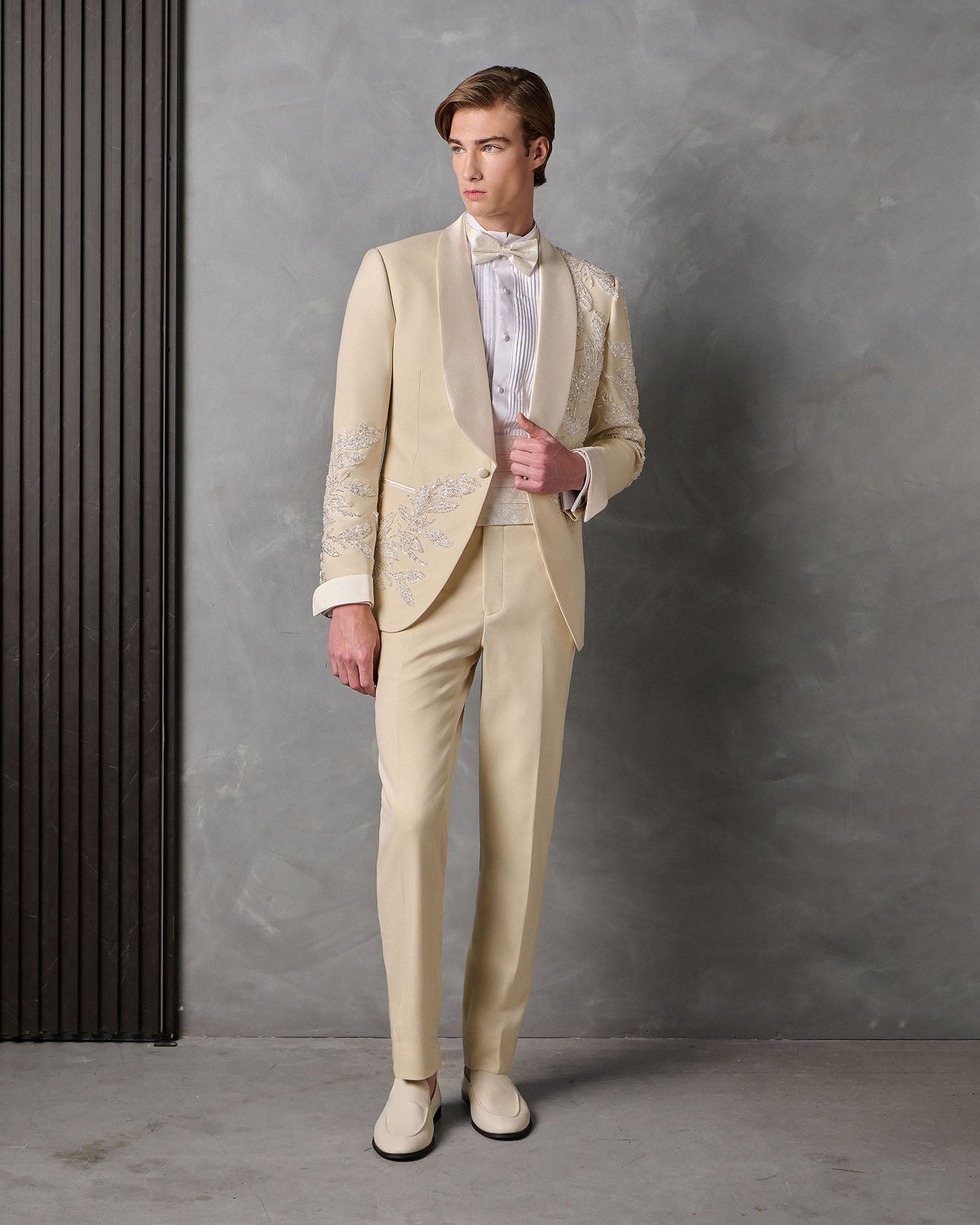 Tailored in a ivory super 120's wool from Italy. Trimmed in silk mikado and embellished with crystal beaded lace.