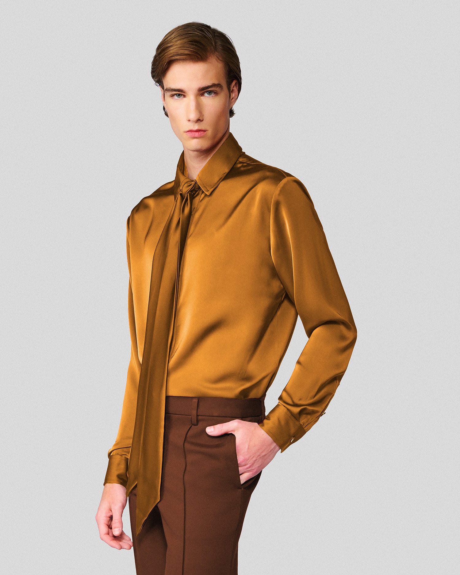 The Ricardo Shirt is a made from sumptuous satin and features a separate scarf that can be worn in a variety of ways, but looks best left loose for a modern relaxed look.