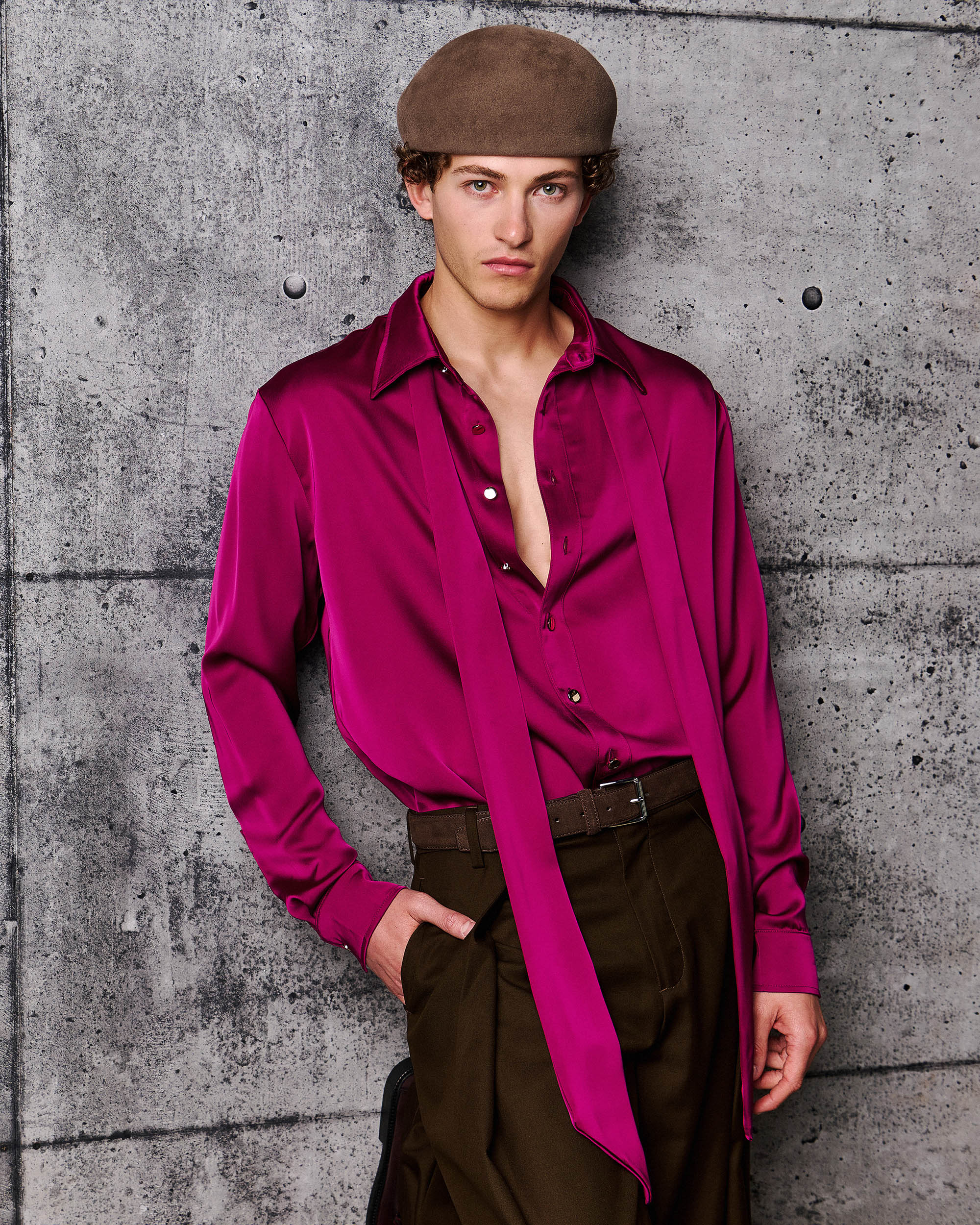 The Ricardo Shirt is a made from sumptuous satin and features a separate scarf that can be worn in a variety of ways, but looks best left loose for a modern relaxed look.