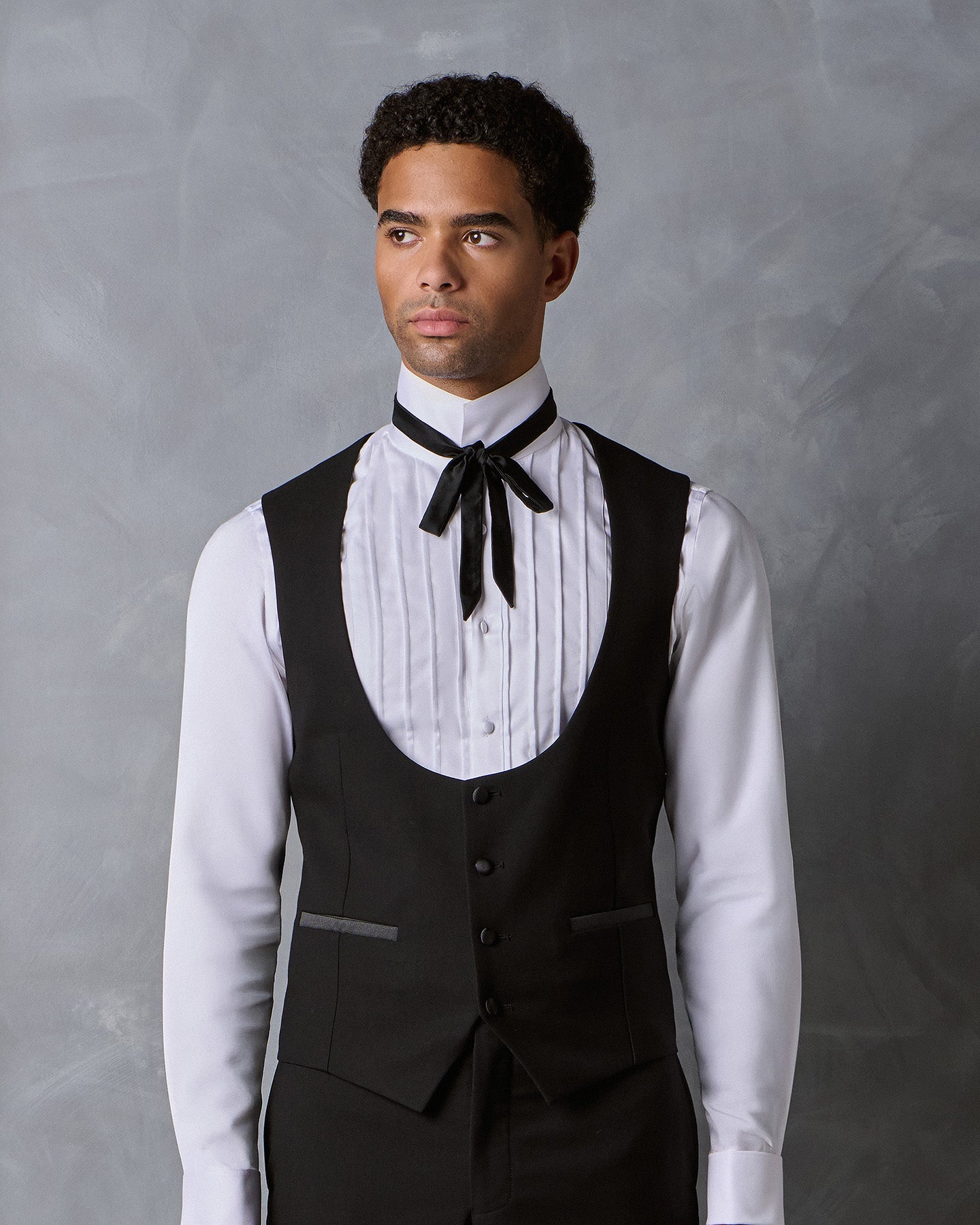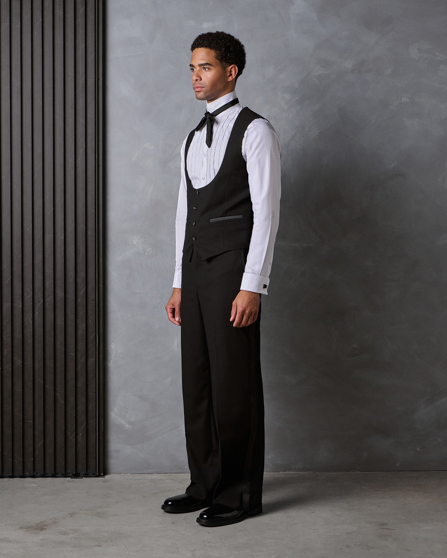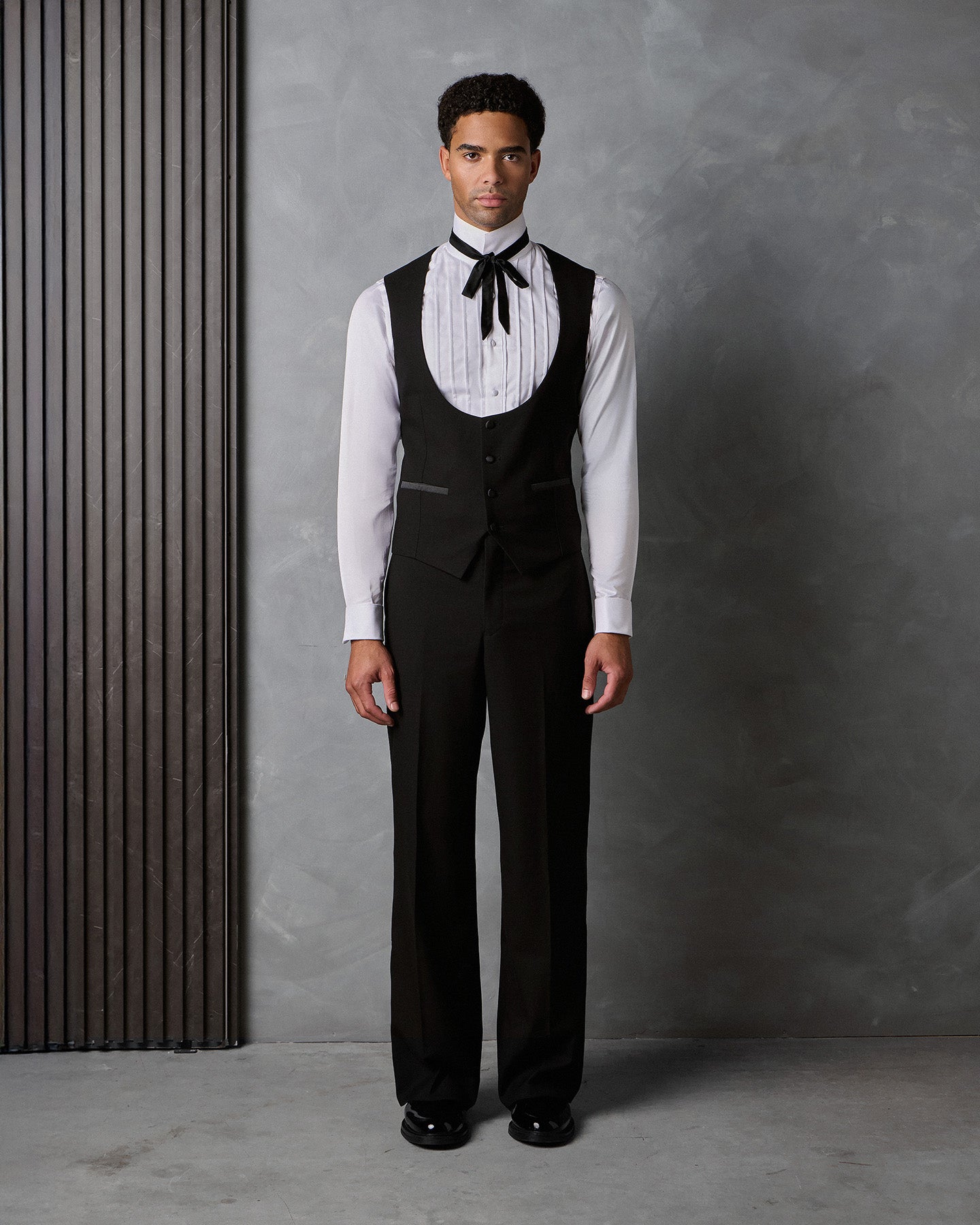 Tailored in a black super 120's wool from Italy. Trimmed in silk mikado.