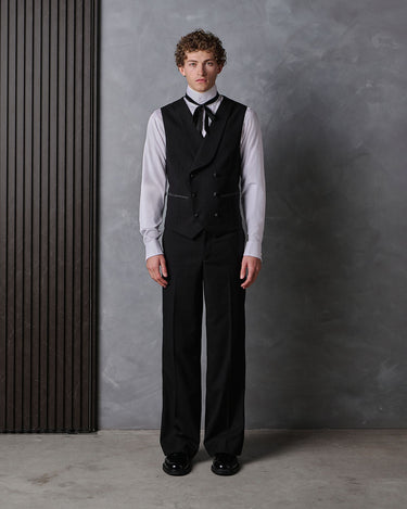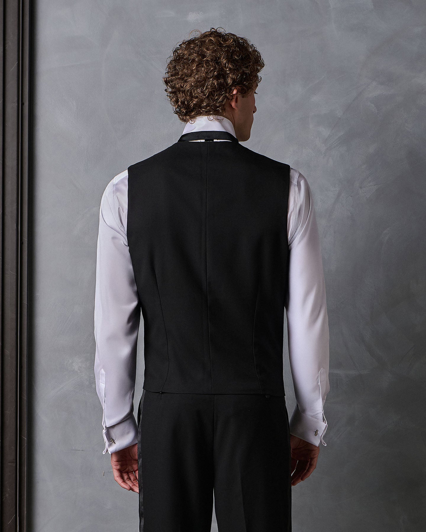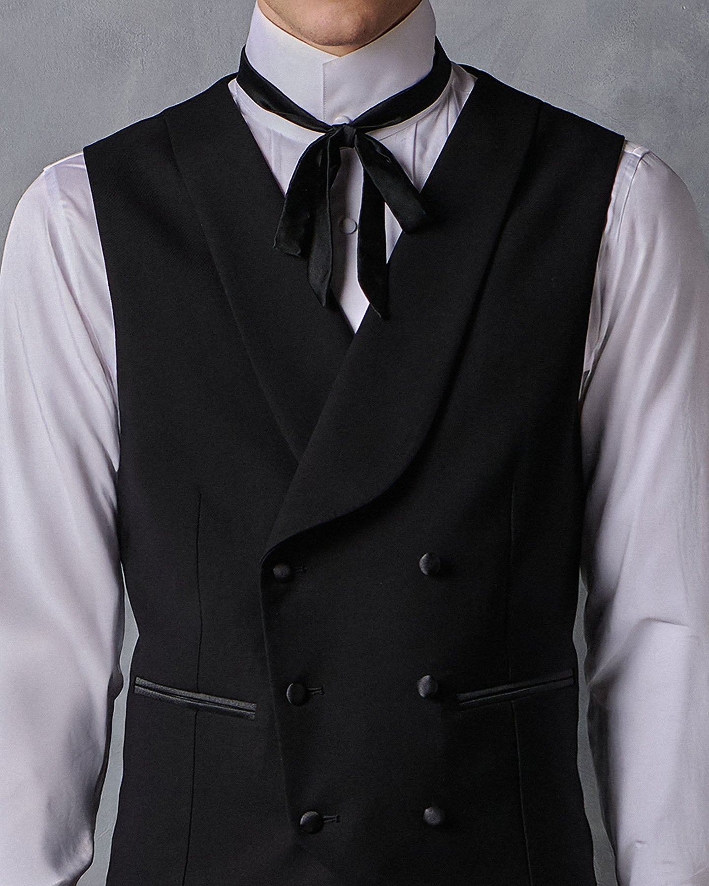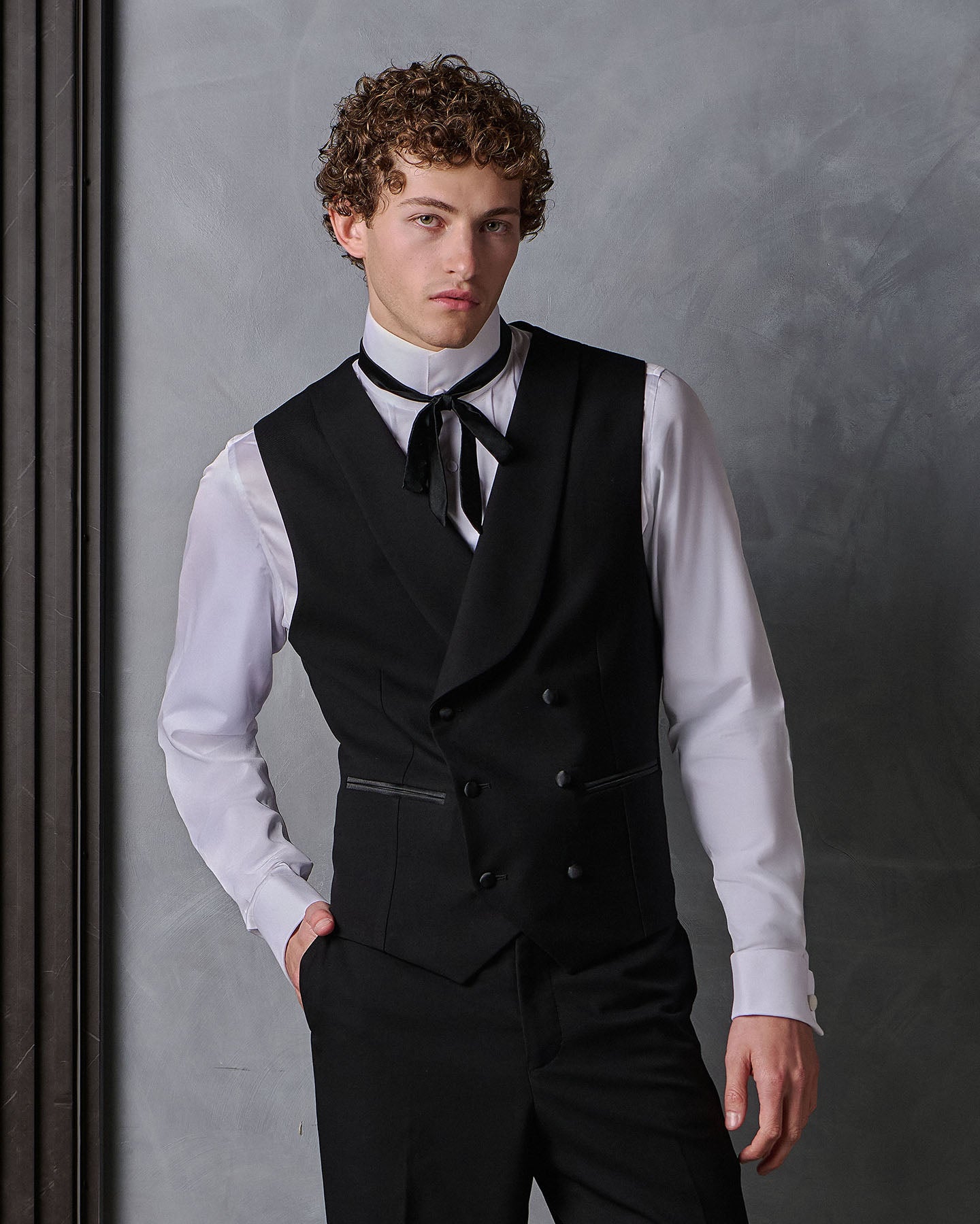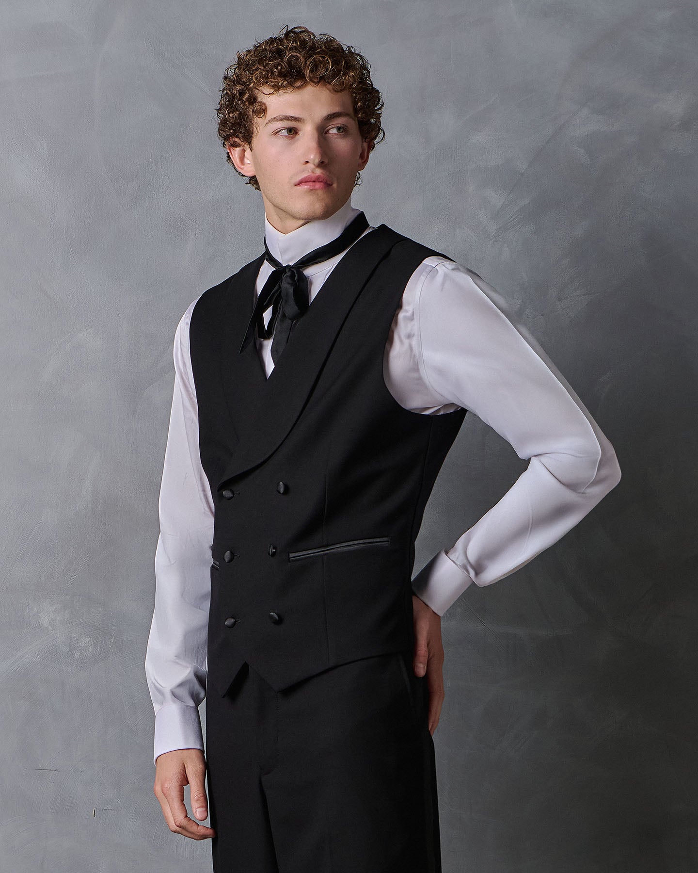 A fitted waistcoat features a double breasted closure and shawl collar lapel. The interior is fully finished in black satin lining.