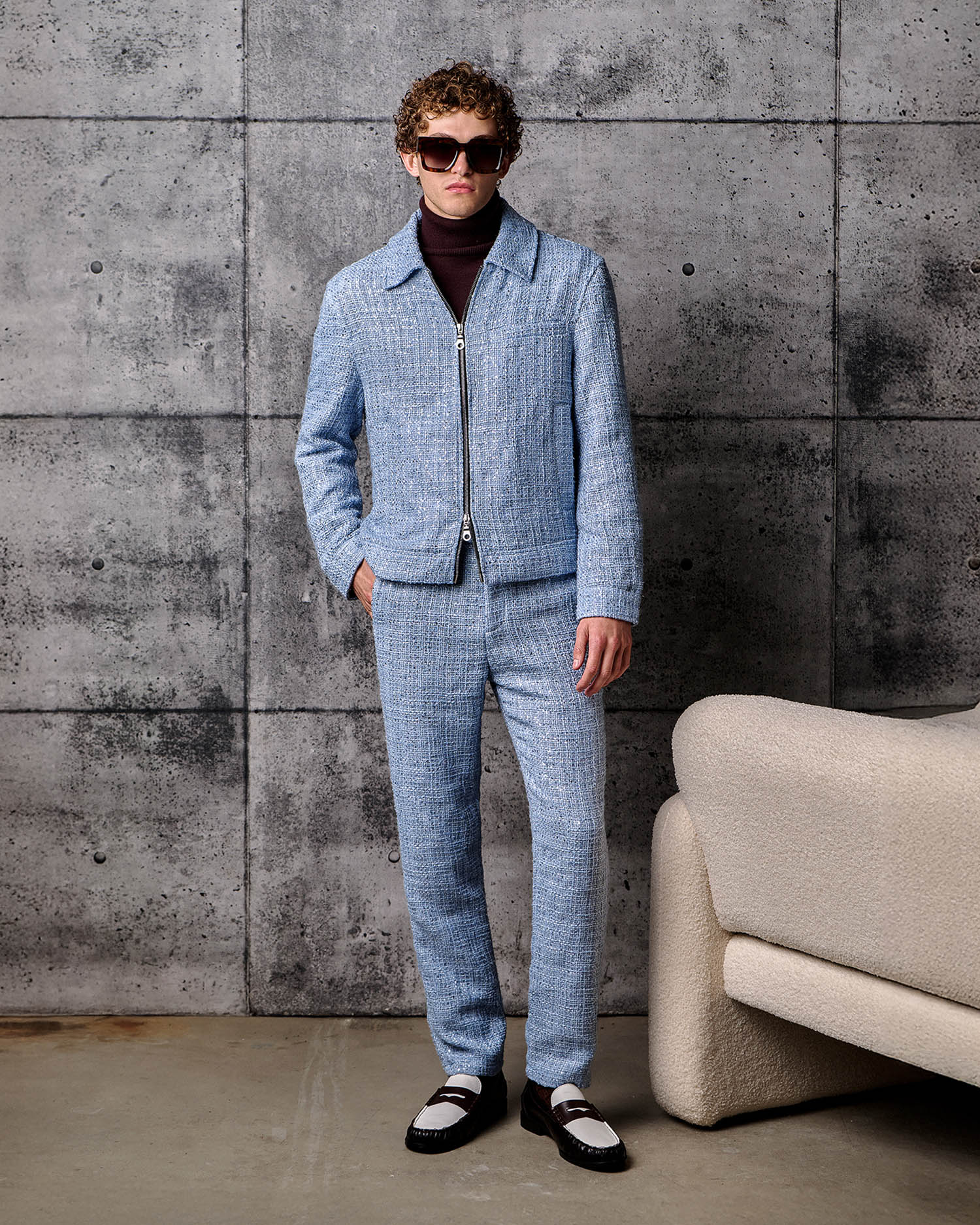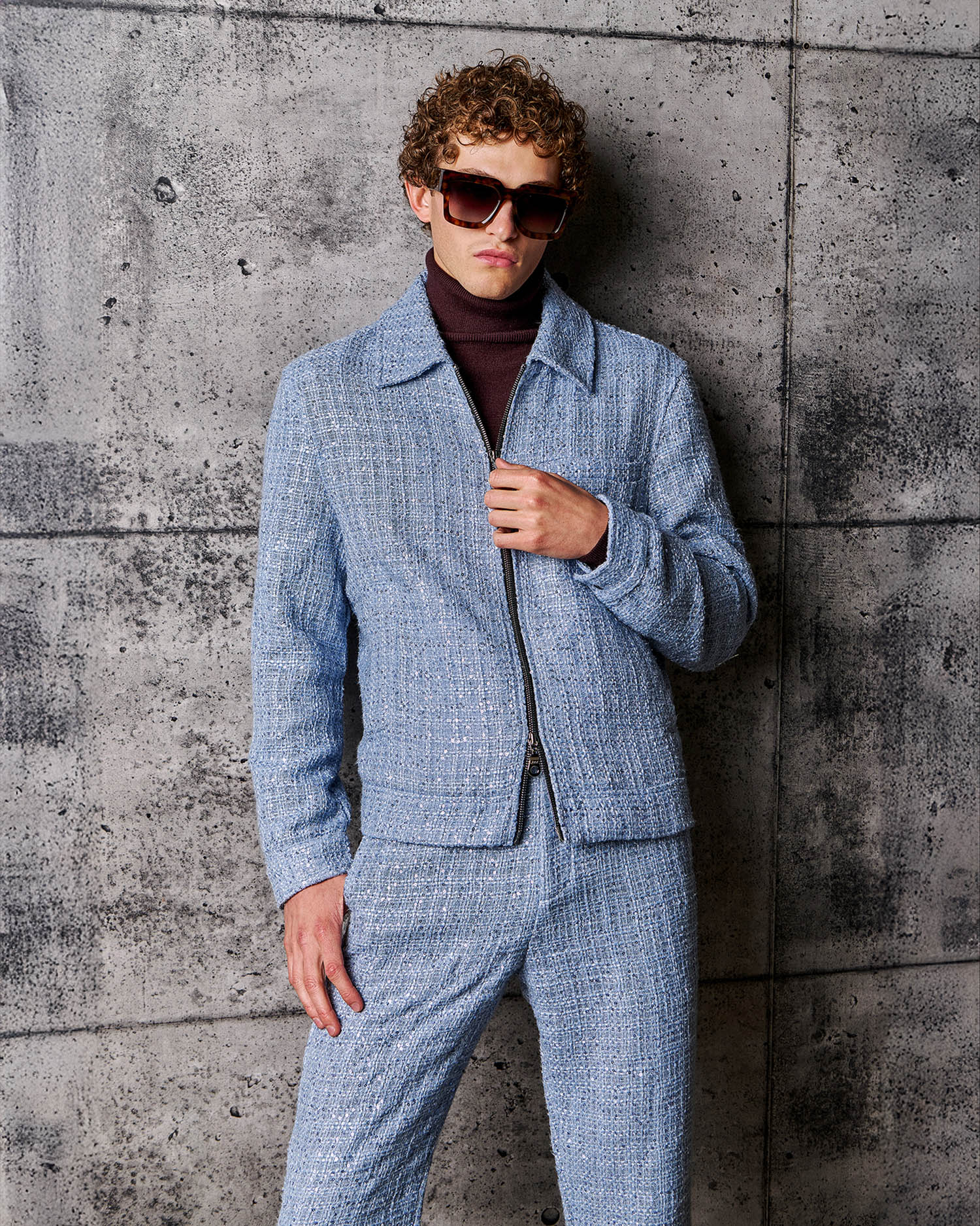 The Avalon Jacket updates a classic menswear style with a pop of pastel blue. Made from a rich tweed dusted with mini silver sequins this eye catching piece will lift your spirits.