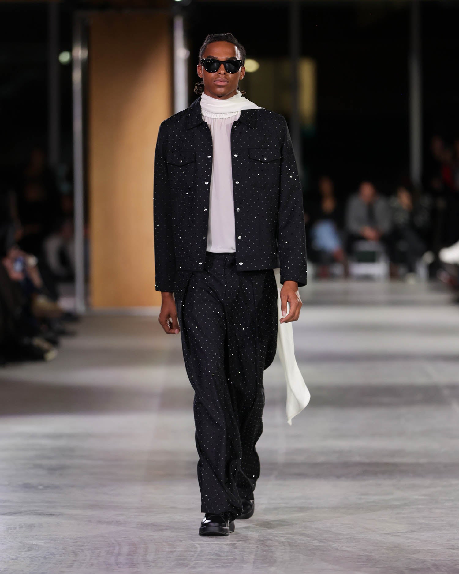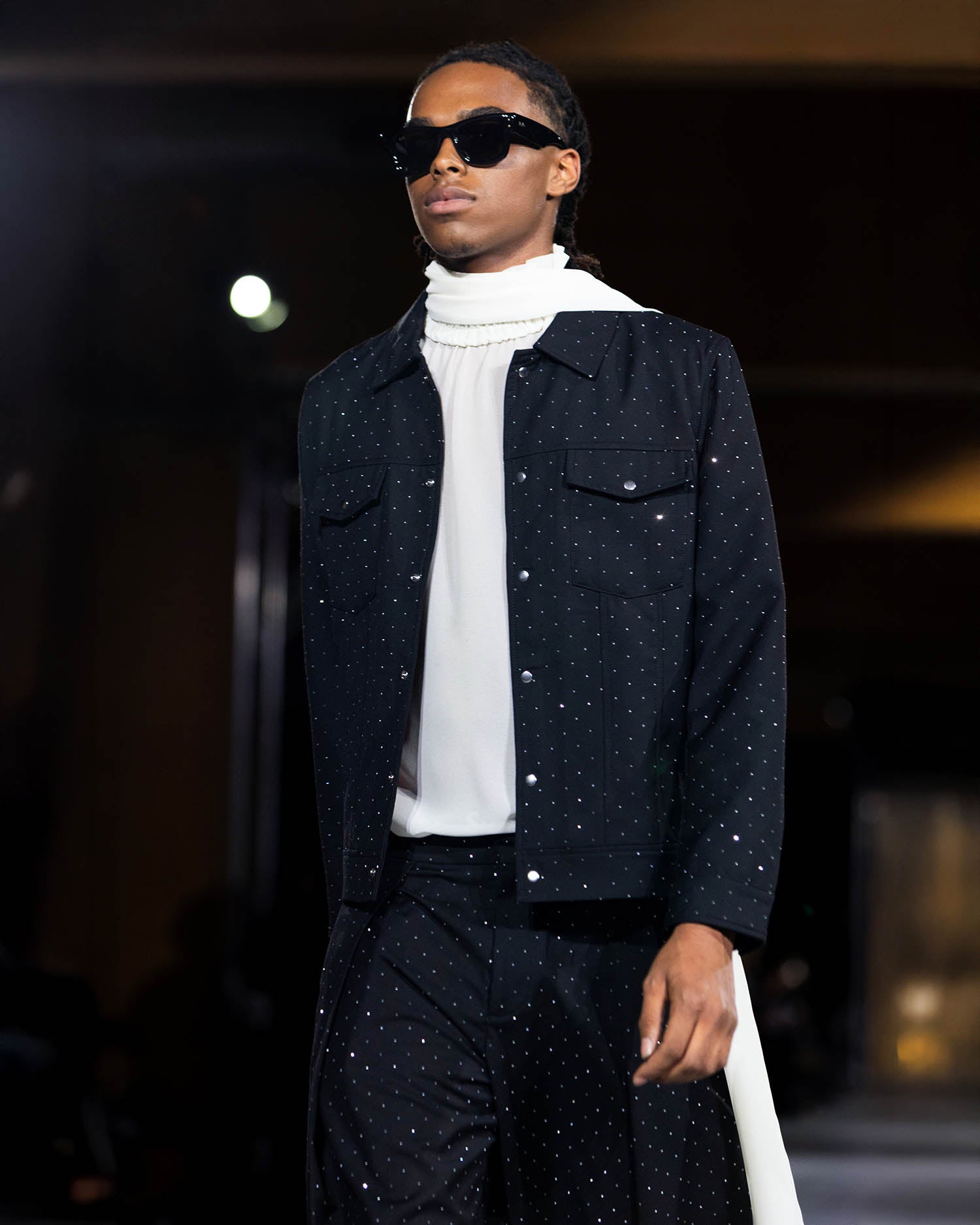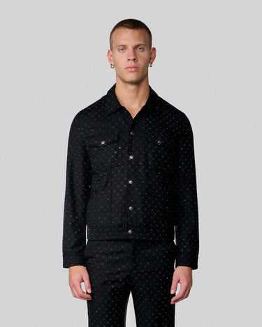 Dimitry is a classic trucker jacket made from charcoal melange denim covered in silver crystals.