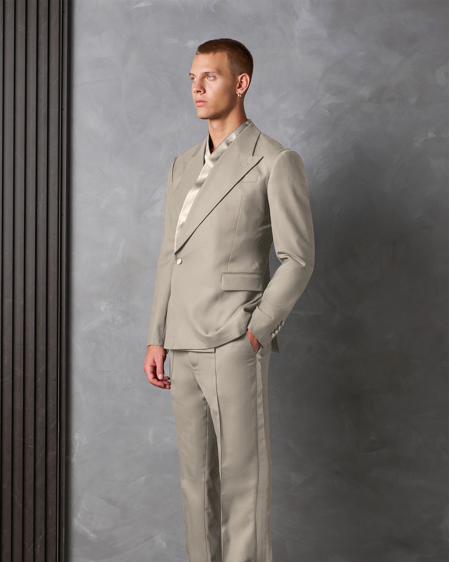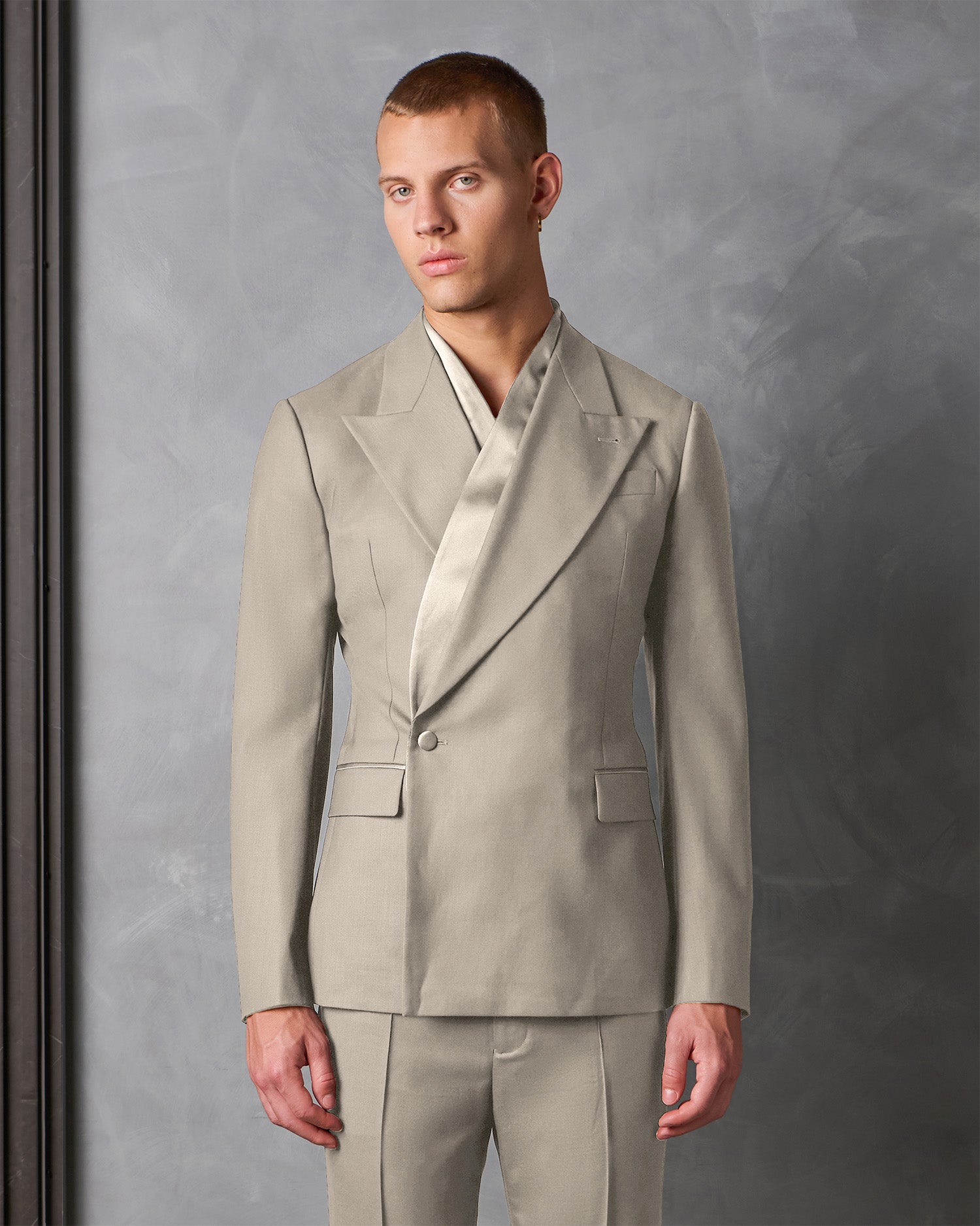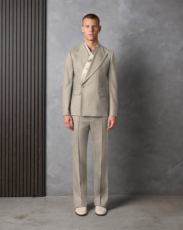 The Hayden Suit features a wrap front design blazer with a removable satin collar piece and is crafted from platinum Italian super 120's pure wool.